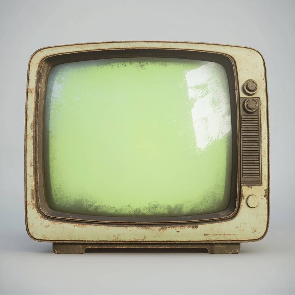 Uma velha televisão com estilo clássico dos anos 70 e tela verde ácida plana, fundo branco.