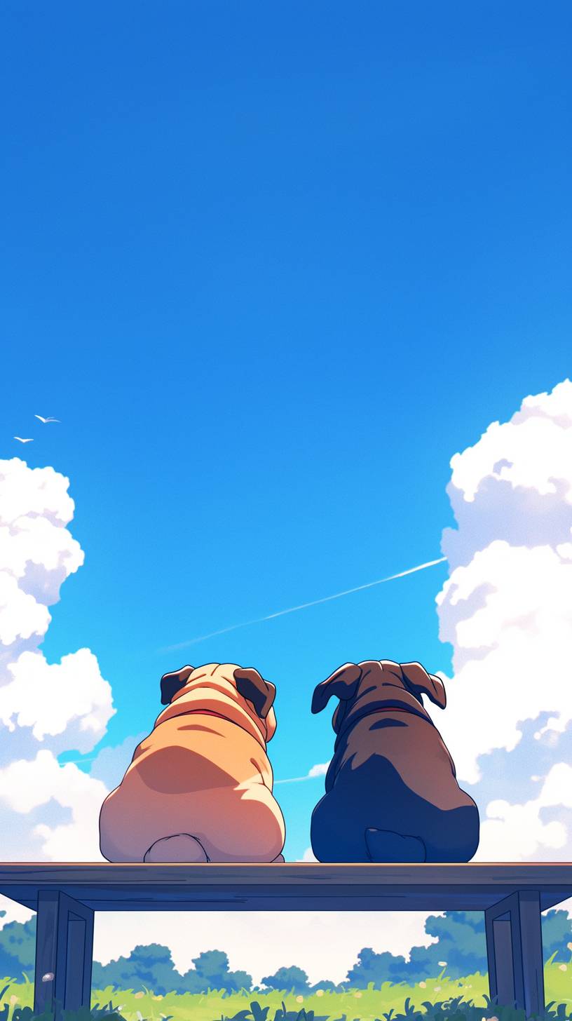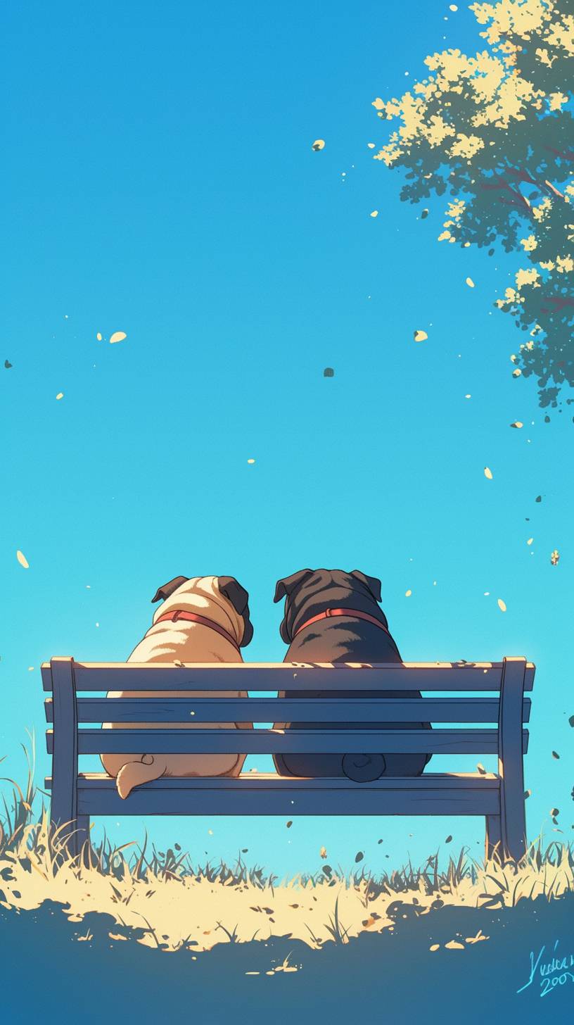 minimalist comic, the back of a fat cute pug dog and a black bulldog puppy on a wooden bench on the grass, delicate fur, real, blue sky --ar 9:16 --niji 6