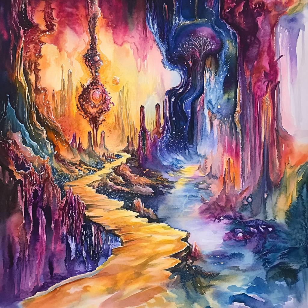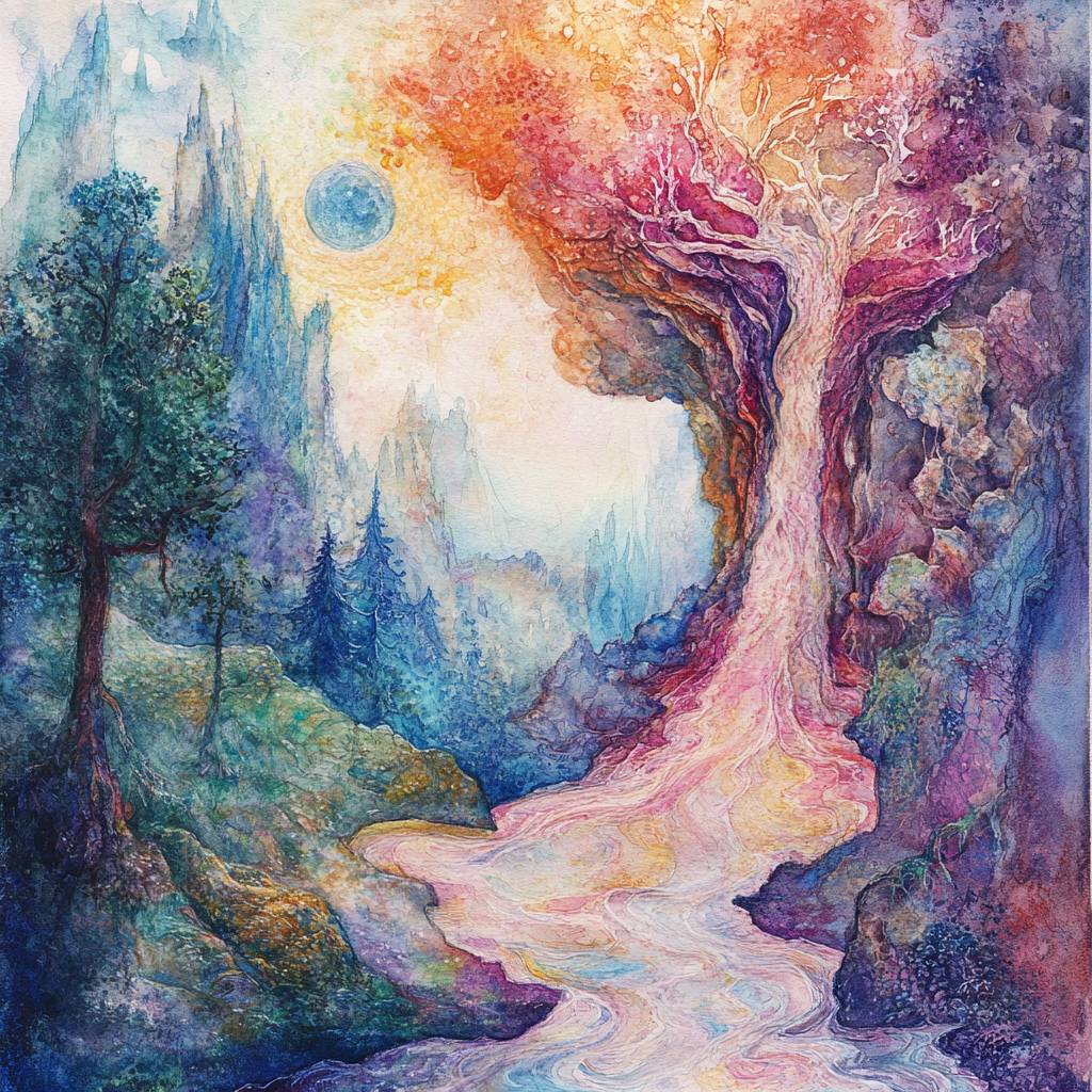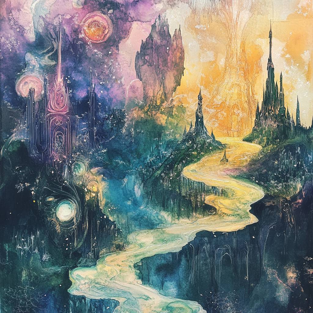 Pinceladas de aquarela de um tema místico em uma paisagem de fantasia