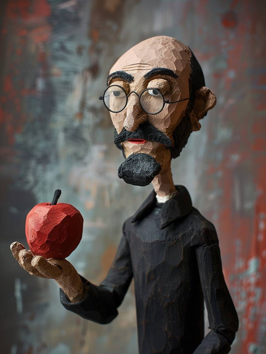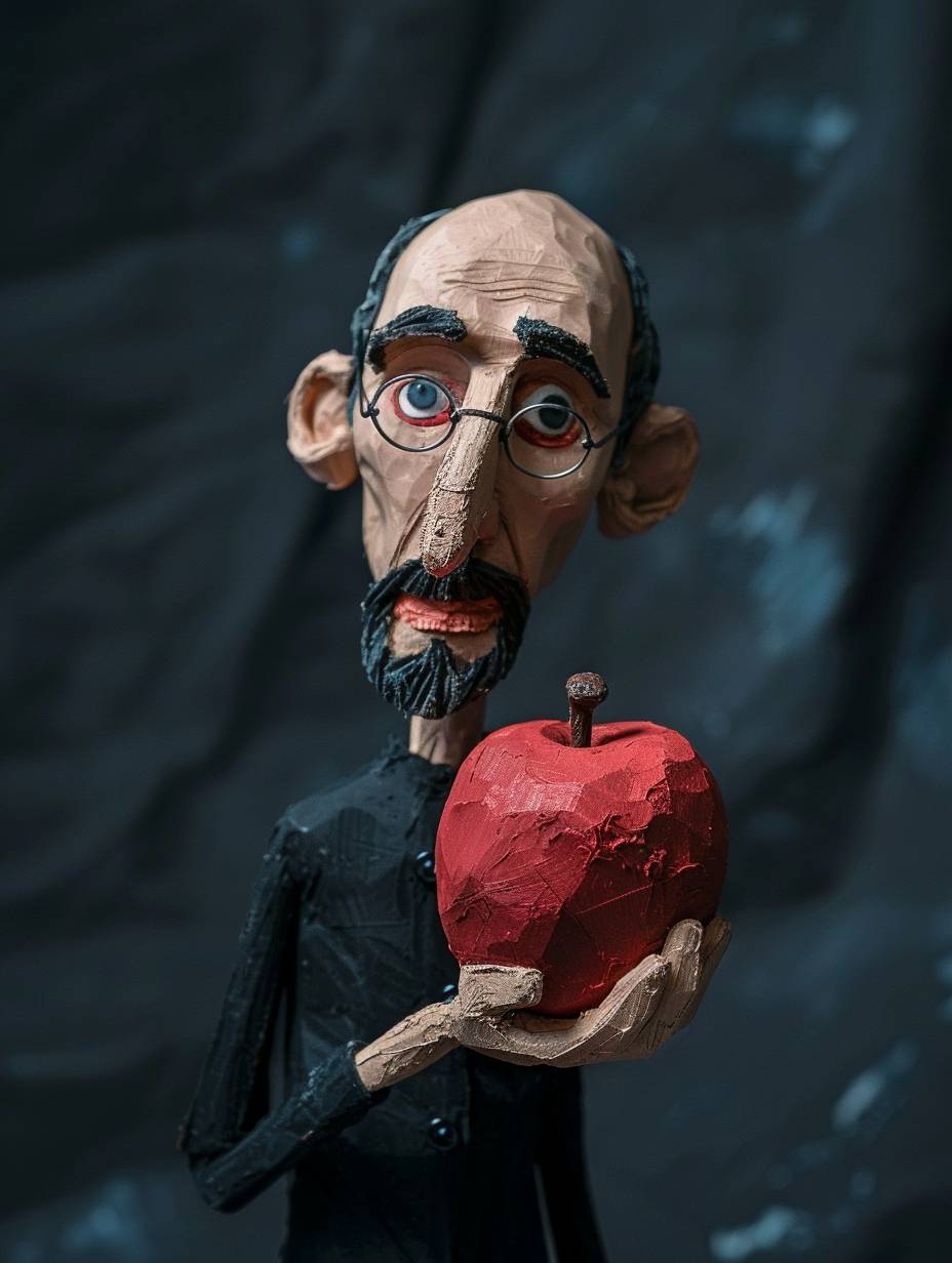 Retrato em Claymation de Steve Jobs segurando uma maçã em um estilo abstrato, semelhante ao de Shaun the Sheep e Malika Favre.