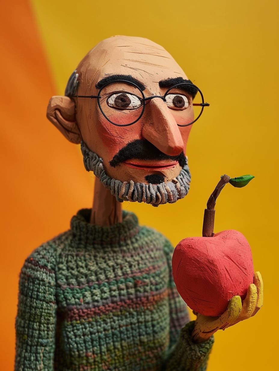 Claymation portrait of Steve Jobs, holding an apple, abstract claymation, Shaun the Sheep style, Malika Favre style --ar 3:4 --v 6.0