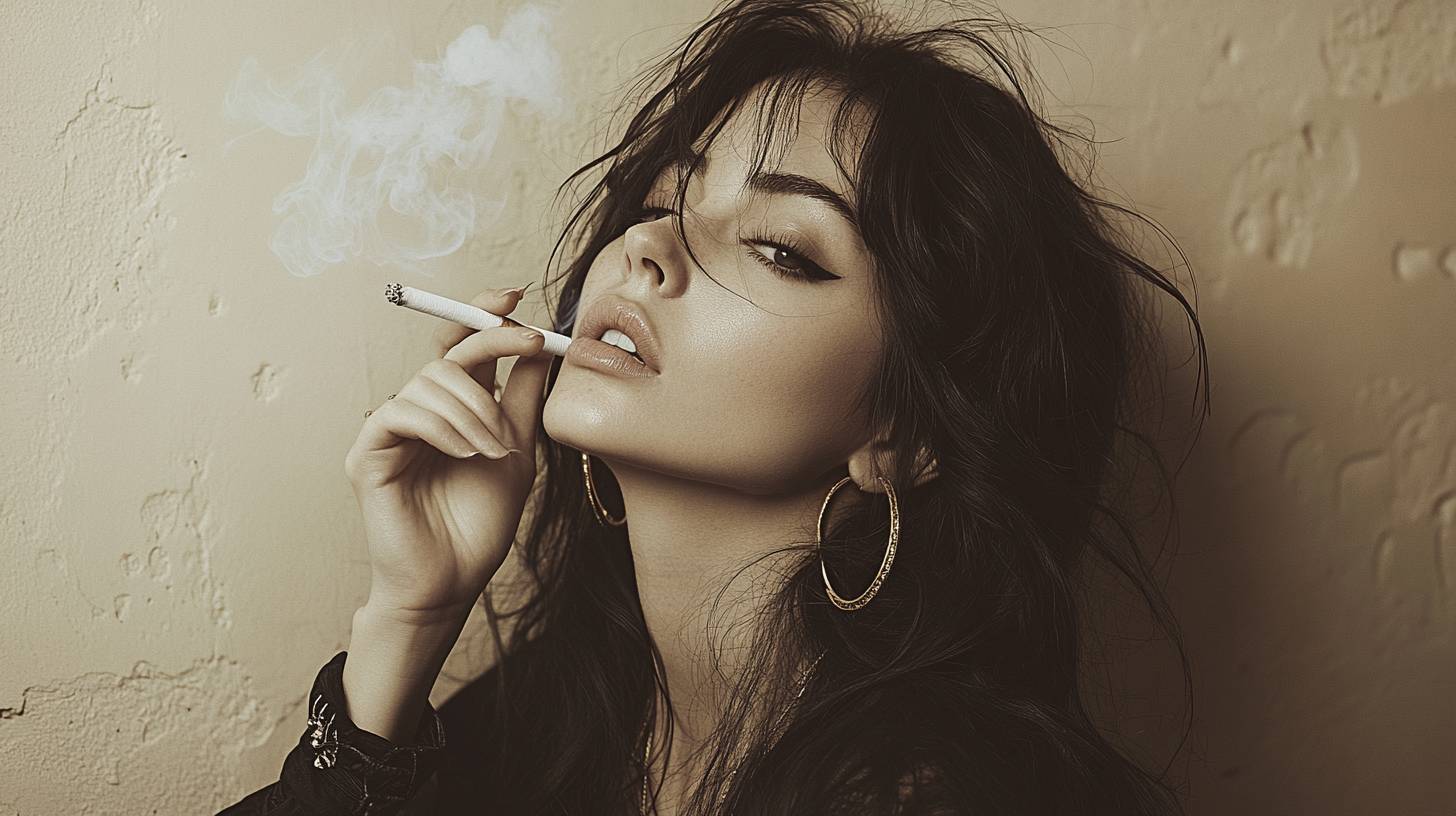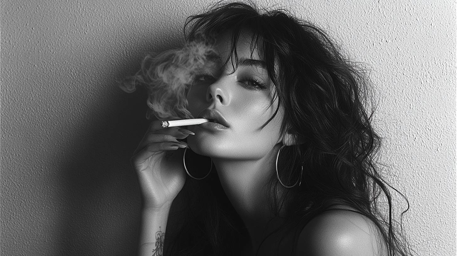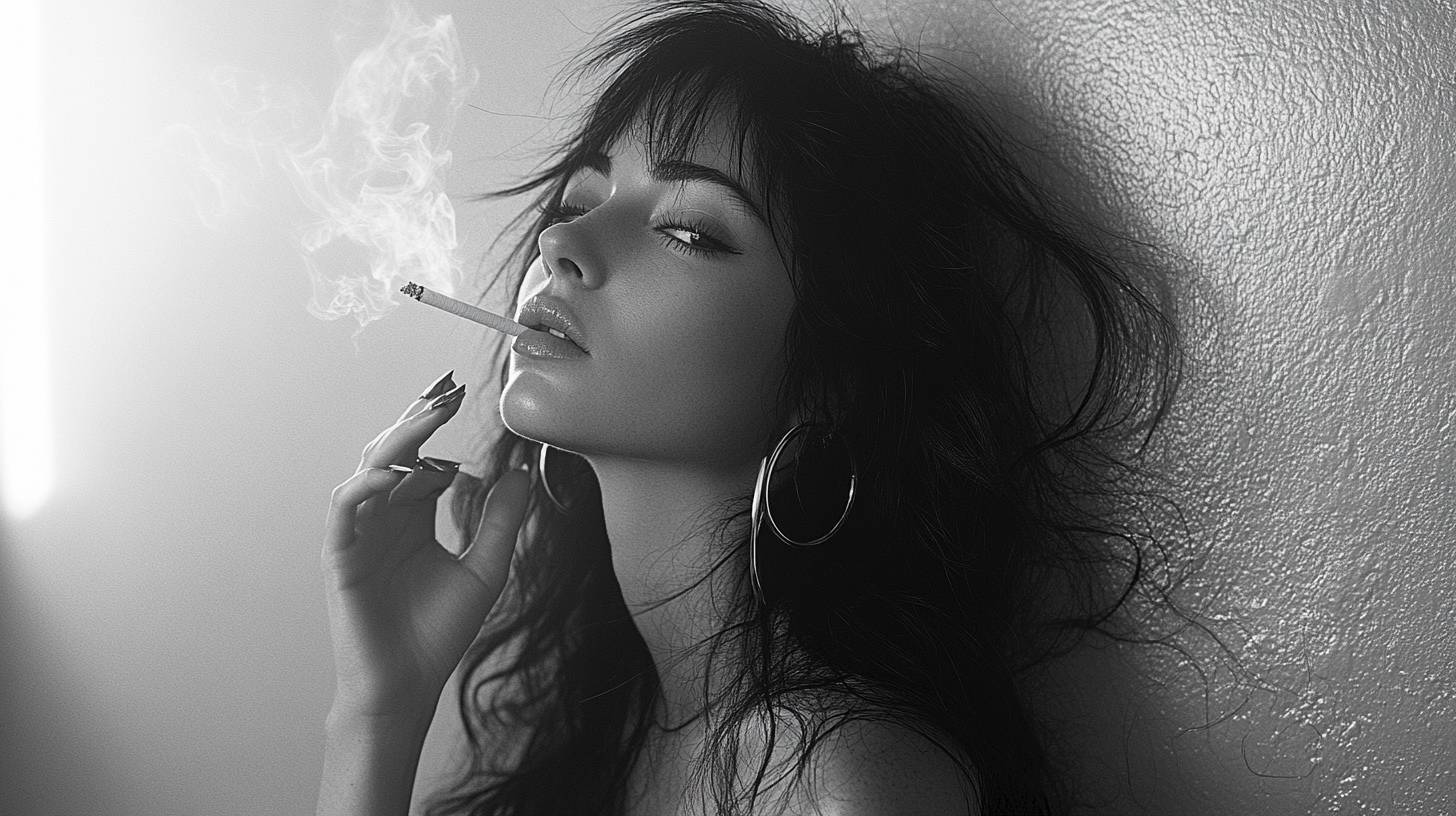 Uma fotografia em preto e branco de uma mulher atraente com cabelos longos e escuros, fumando um cigarro enquanto usa grandes brincos de argola e roupas modernas, tirada de perfil. O fundo é uma parede texturizada de creme. Ela está levantando a mão para cobrir metade do rosto enquanto fuma o cigarro. Fotografada com filme Kodak Portra.