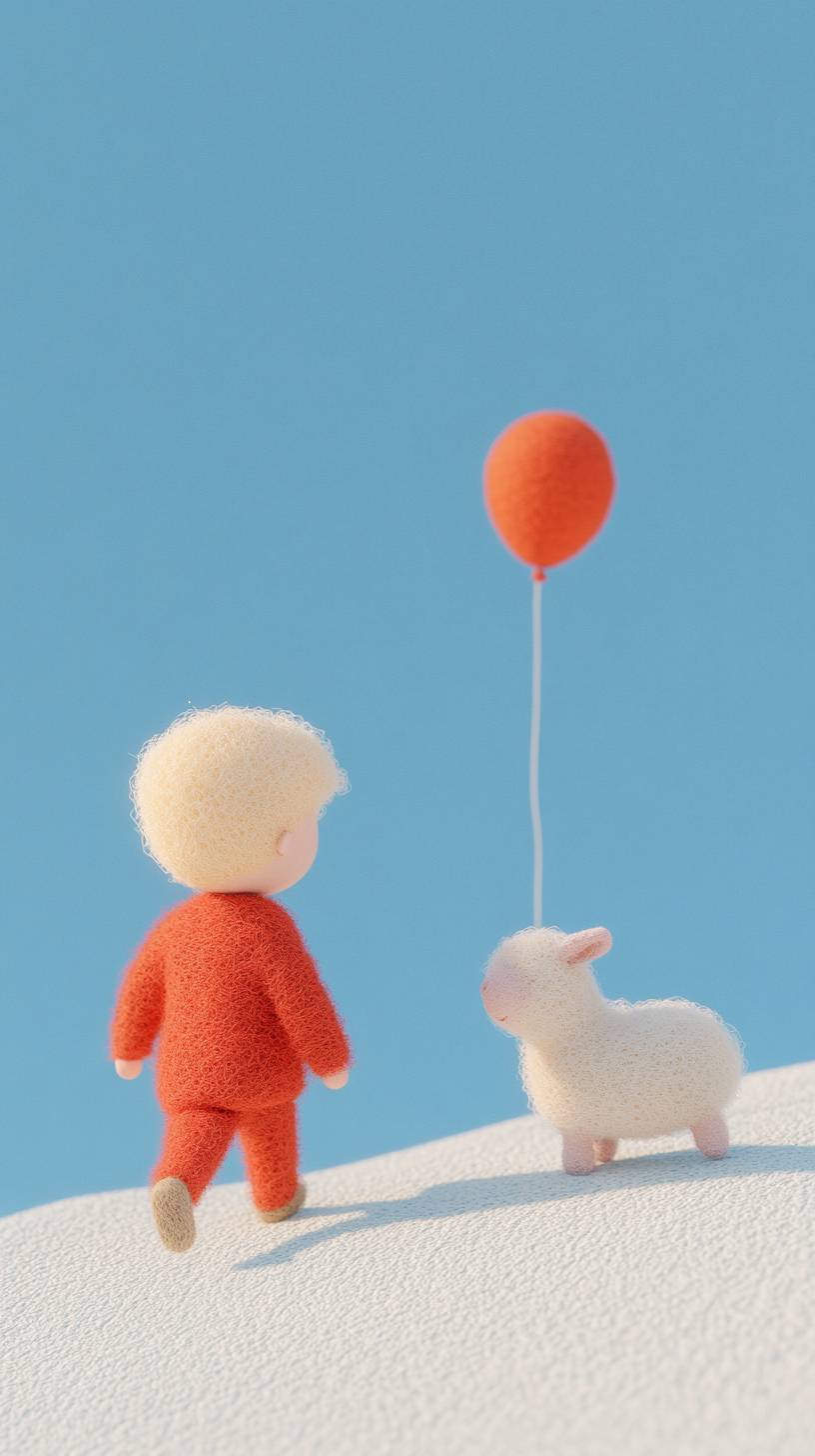 A small boy with balloons and a lamb enjoying a day at a felt amusement park, riding different attractions, super felt style cartoon, very strong felt style, very good felt creation, felt material, axis shift photography, macro scene, minimalism. Top-down view of the boy and lamb running towards the roller coaster, colorful attractions and vibrant lights scattered across the park, soft sunlight casting long shadows. Created using: exaggerated perspective, smooth shading, vibrant colors, soft felt textures, dynamic lighting, playful and energetic atmosphere --ar 9:16 --personalize kzilt9y --stylize 1000 --v 6.1
