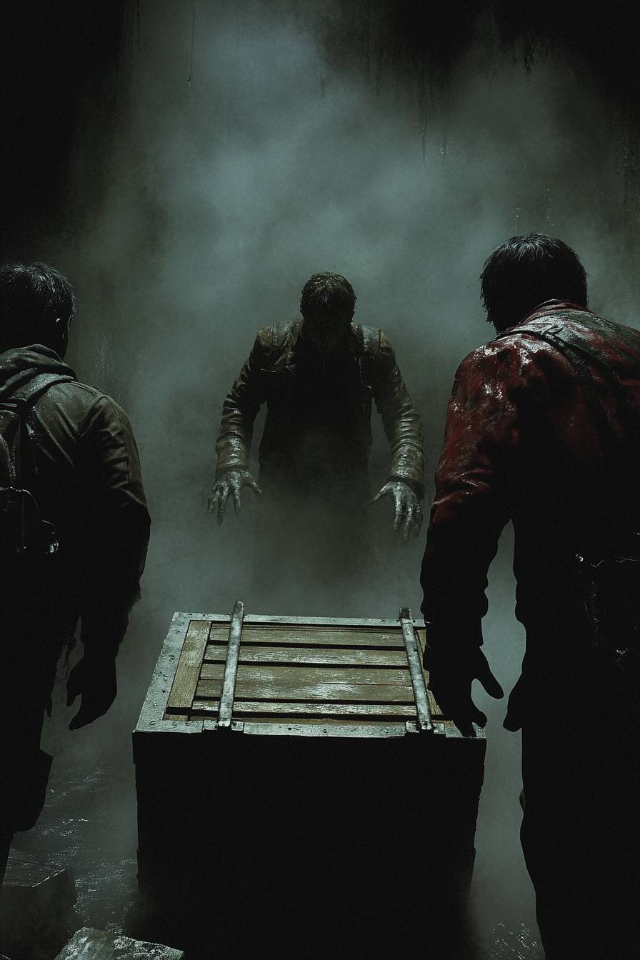cinematic shot, three college students are trying to open a treasure crate located in the center of the crypt, the unknown threat is approaching them, set a Forgotten Crypt scene cover by mist, haunting ghost in the mist, create an eerie atmosphere --c 10 --ar 2:3 --style raw --sref 1580947483 --sw 200 --s 300 --v 6.1