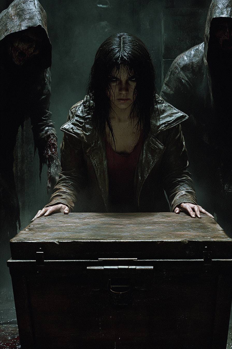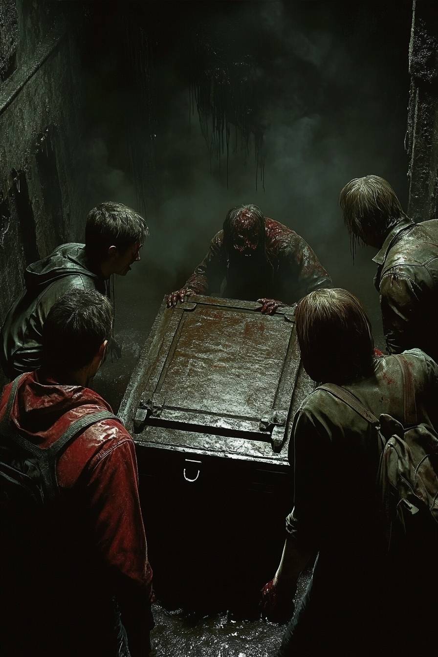 Em uma cena cinematográfica, três estudantes universitários estão tentando abrir um baú de tesouro localizado no centro da cripta. Uma ameaça desconhecida está se aproximando deles, ambientada em uma cena de Cripta Esquecida coberta de névoa, com fantasmas assombrando a névoa, criando uma atmosfera sinistra.