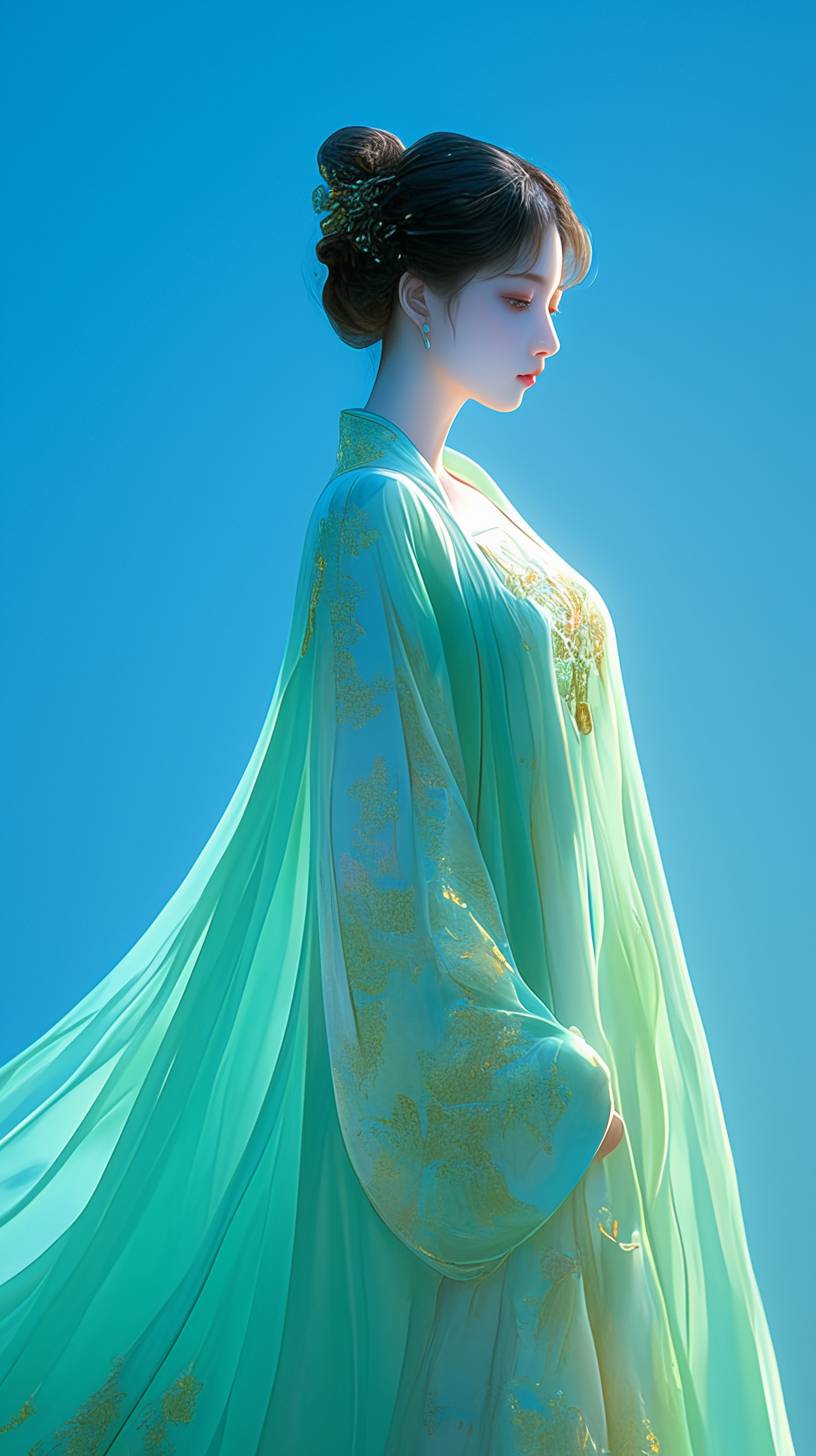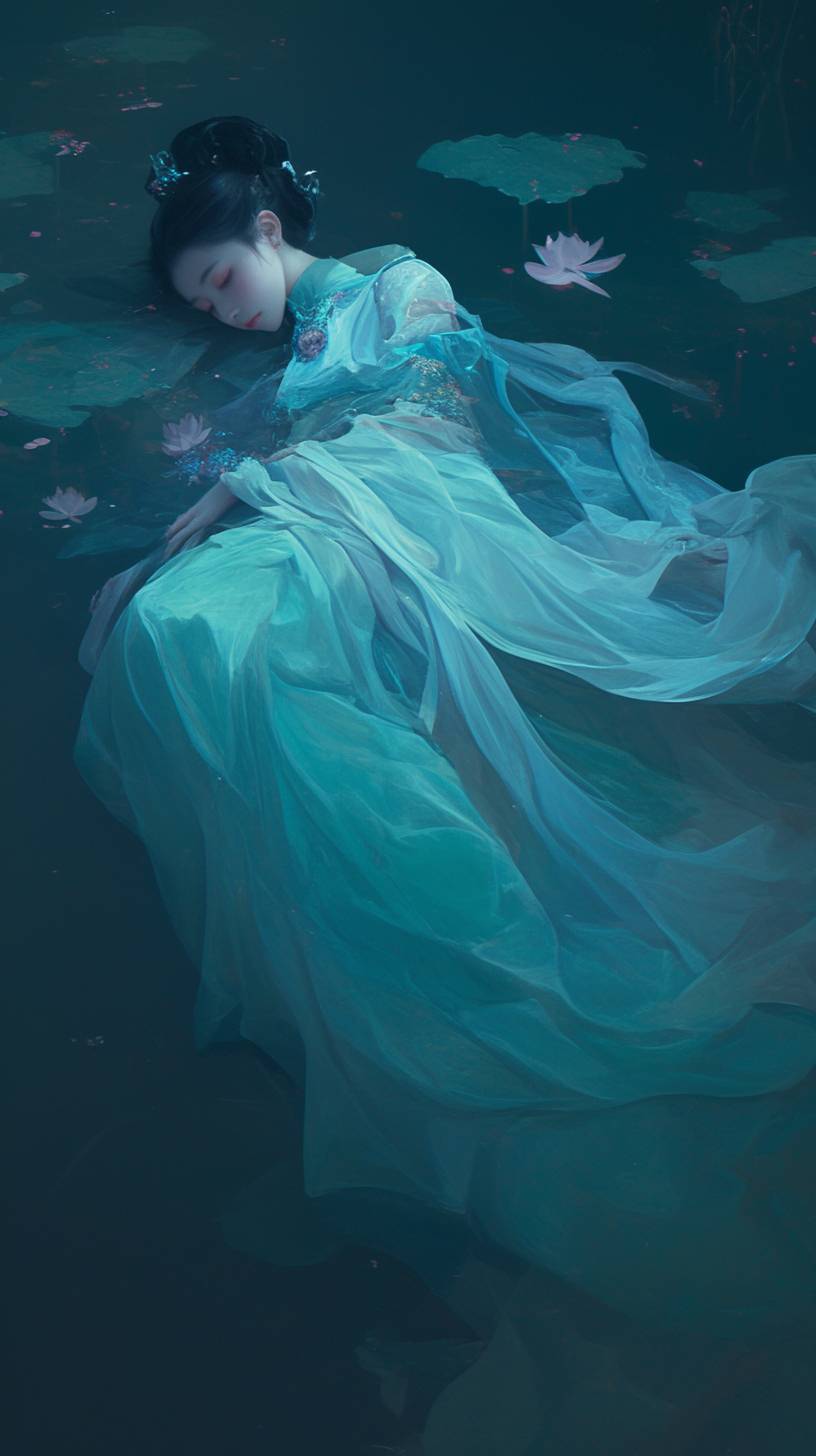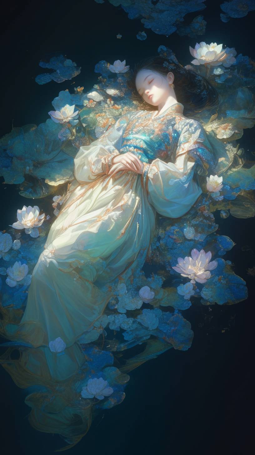 Nick Veasey,traditional Chinese style, traditional Chinese style, traditional Chinese style, digital neon style, bioluminescence, Hosta Green,color palette + ultimate,A beautiful Chinese Tang Dynasty beauty,High-definition fashion photography, high-end, ambiguous atmosphere, The artistic style of French post-impressionist painter Ferdinand Loyen Du Puigaude, Soft Cobalt Blue color + lotus pattern + heavy gauze skirt, Ancient style fairy, wearing a white fairy gauze dress, lying elegantly in the peach blossoms. Chinese style fairy Hanfu, full of broken feeling, movie poster, 8k, ultra-clear picture quality, movie-level lighting --ar 9:16 --niji 6