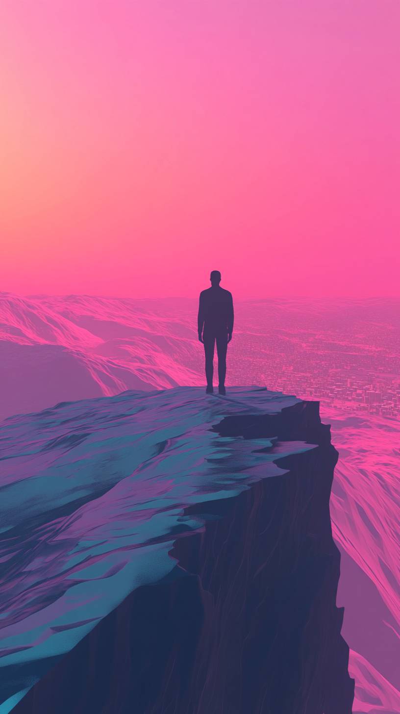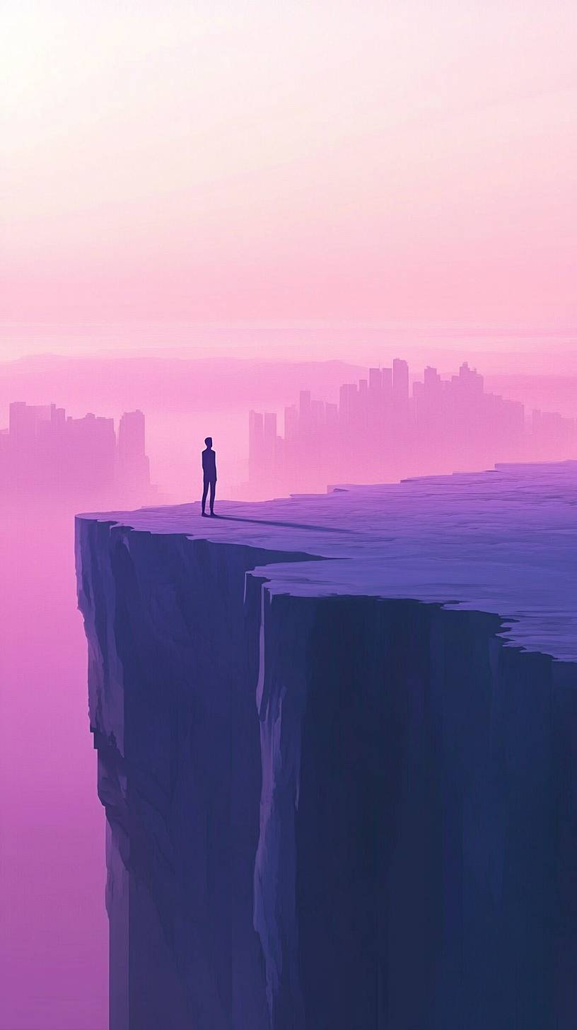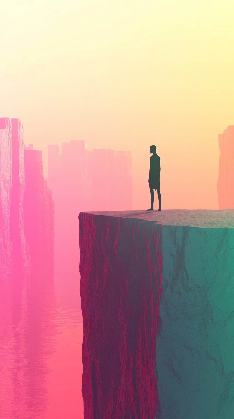 A 3d illustration of a solitary figure stands at the edge of a vast contemplating the meaning of life, The landscape is barren and abstract, with hints of a city in the distance, symbolizing isolation and personal reflection. In a surrealistic, dreamlike style with soft lighting and symbolic elements, evoking deep reflection and abstract thought, colorful gradient background, vector art style, high contrast --ar 9:16 --v 6.1