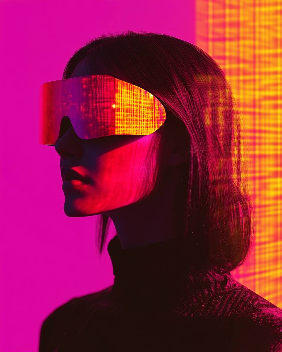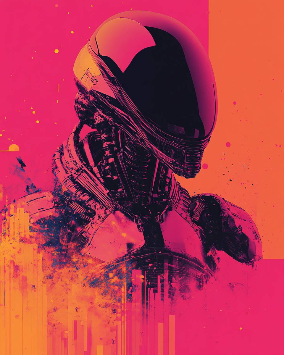 Attractive woman wearing low polygon xenomorph suit, retrowave synthwave vaporwave cyber glitchcore effects, pink yellow glowing holographic fog, cosmic star background VHS tape distortion --c 10 --ar 4:5 --sref 3436952802 --sw 100 --s 300