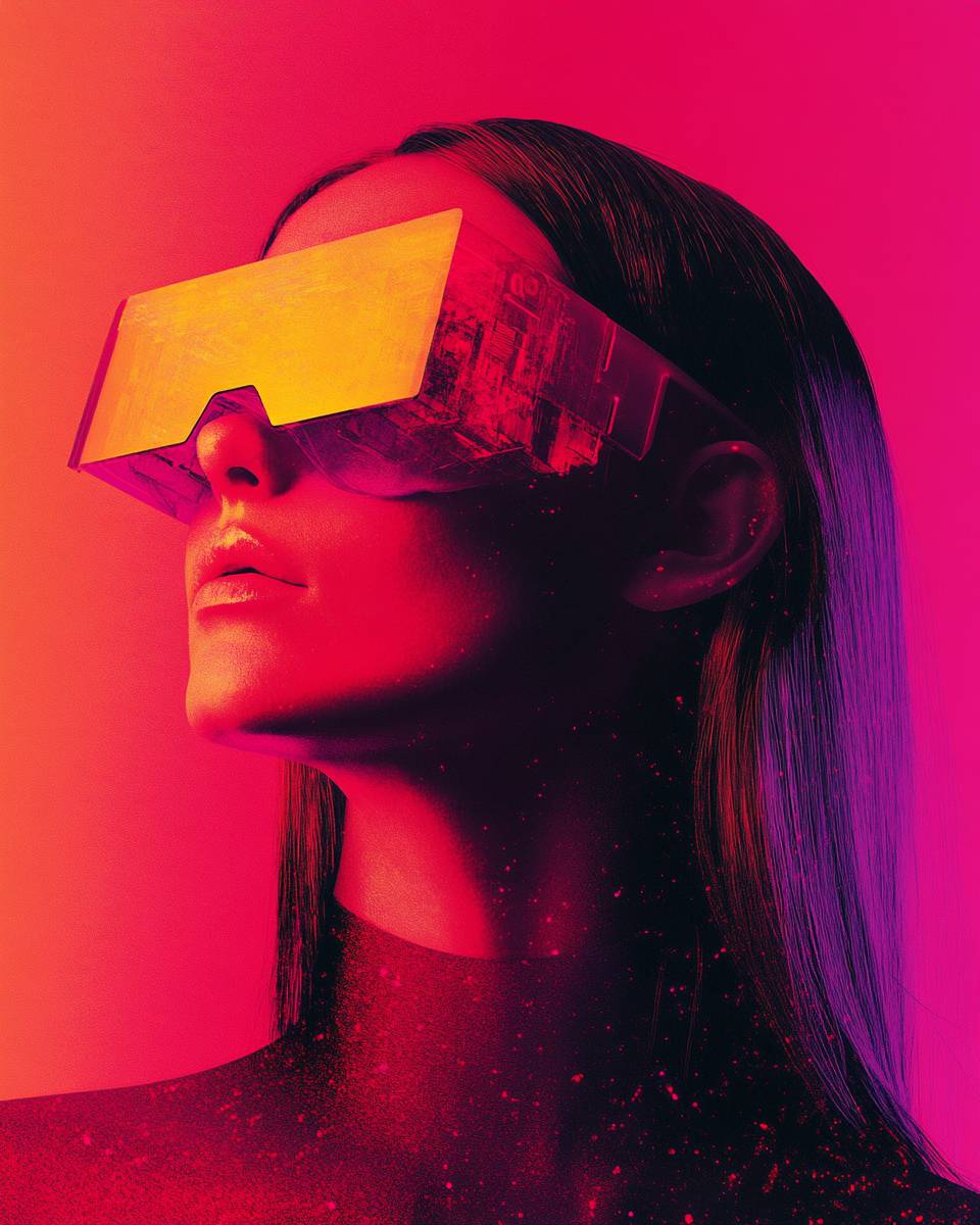 Mulher atraente em traje alienígena de baixo polígono com efeitos oníricos