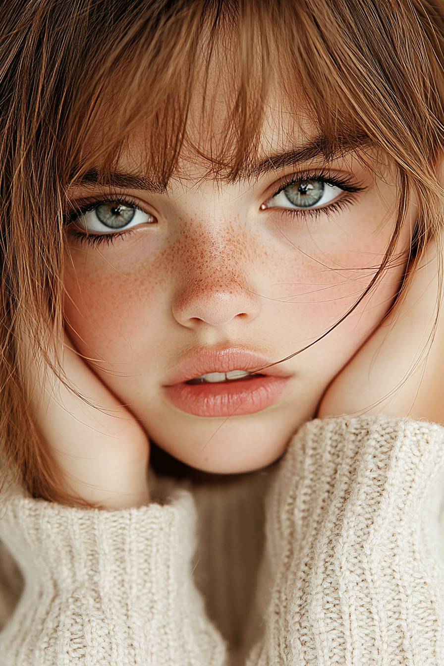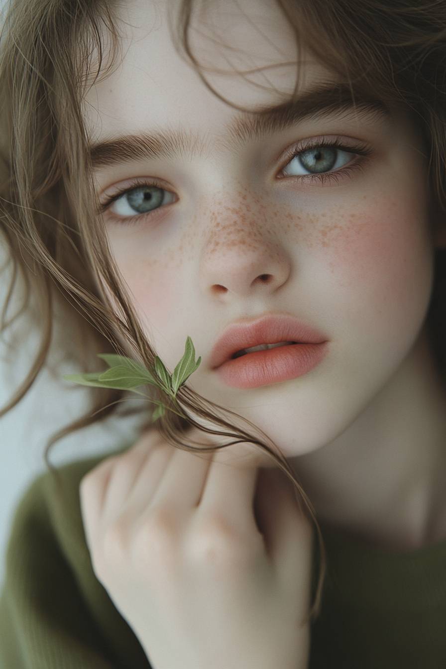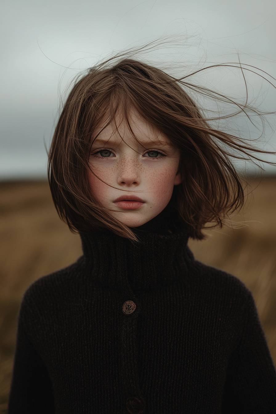 photo of a gentle girl with light brown hair, bob hairstyle, looking forward sweetly. hair fluttering in the wind across her face. atmospheric photo. frame zoomed in to shoulders. --chaos 30 --ar 2:3 --style raw --personalize lkubbth --stylize 600 --v 6.1