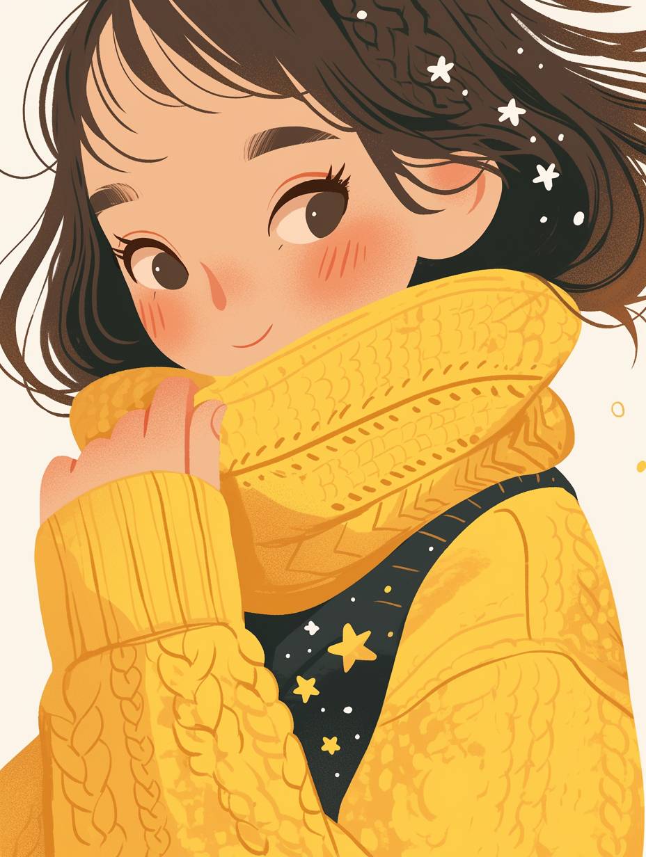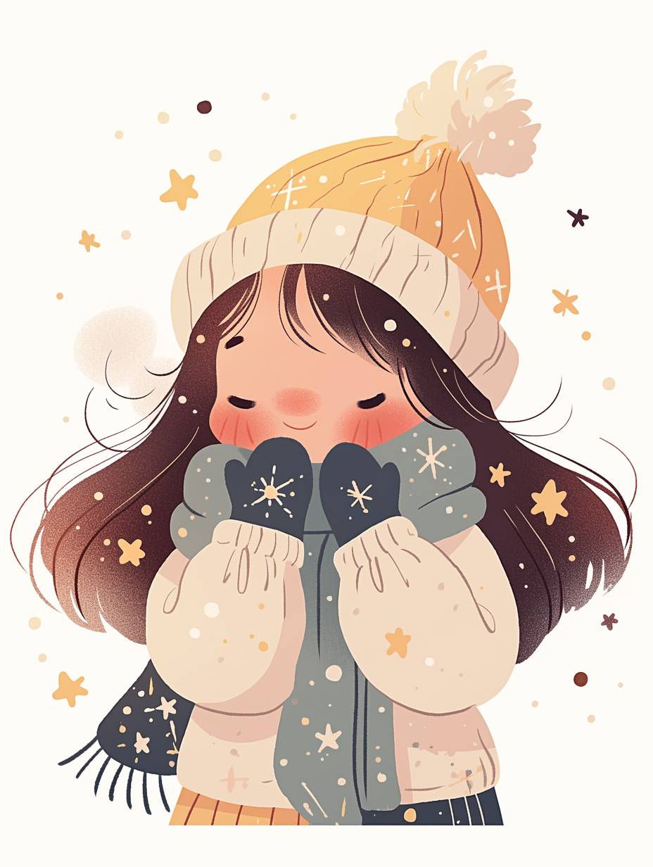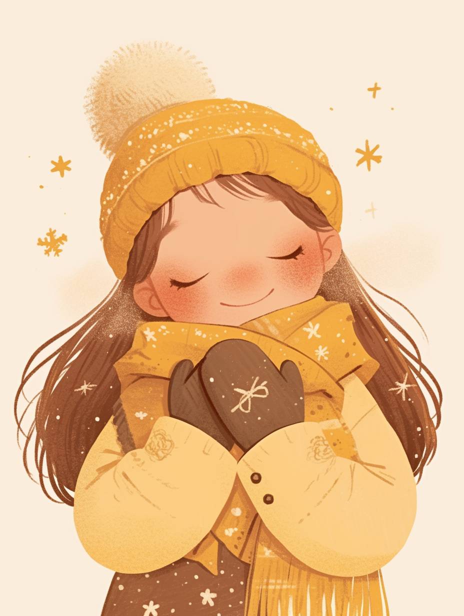 A cute little girl in winter , a simple flat illustration style with minimalist lines and shapes, light yellow tones, and a white background. She is wearing long gloves on her hands, standing sideways, smiling happily. There are stars floating around her, adding an element of fantasy to the scene. The overall color scheme features soft pastel colors, creating a warm atmosphere. --ar 3:4 --stylize 250 --niji 6