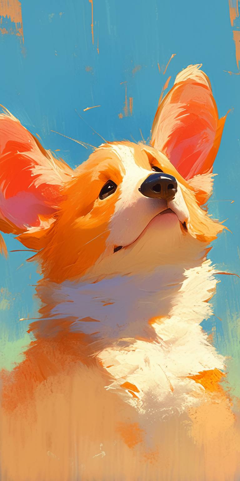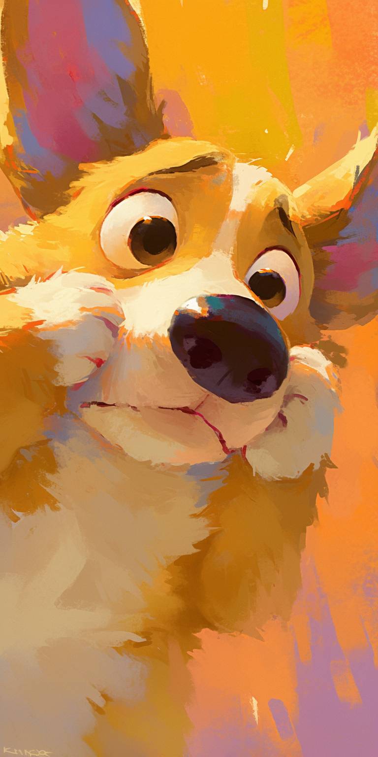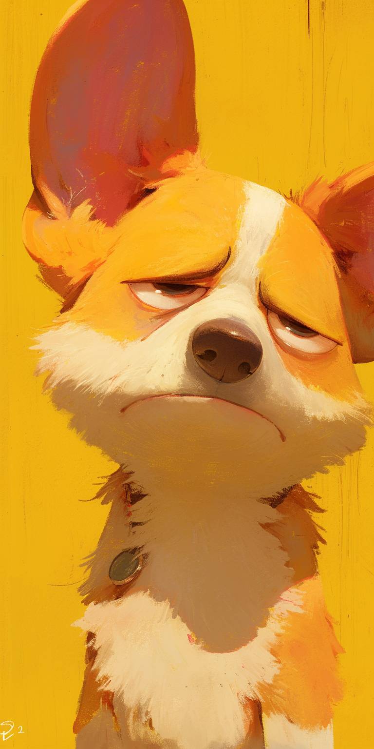 Um Corgi inquieto no estilo de pintura de Van Gogh, grandes olhos, expressão cansada, olhos revirando para a direita, pintura de cartoon do Estúdio de Animação de Xangai, arte 2D do Studio Ghibli, pintura a pincel de Henry Le, fundo de cor sólida, paleta de Marc Rothko, obra-prima, obra-prima, alta resolução, alta qualidade, alto detalhamento, foco claro, close-up facial, f/8