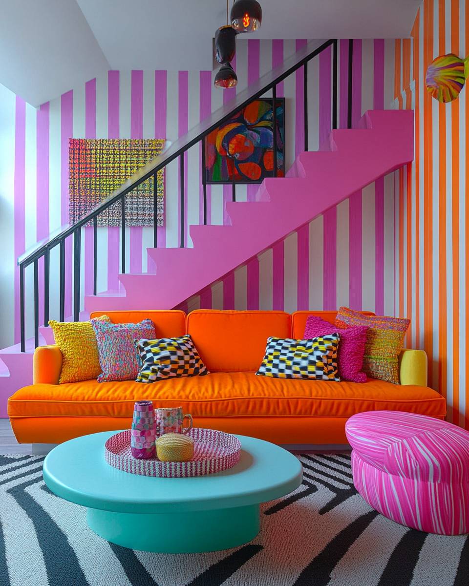 Uma sala vibrante e colorida com papel de parede listrado em tons de laranja, rosa, amarelo, vermelho, roxo, verde, azul, branco e preto, com padrões geométricos nas paredes e móveis brincalhões em cores ousadas, como rosa neon ou amarelo brilhante. O estilo é focado no design baseado em padrões e precisão, reminiscente do movimento artístico do precisonismo.