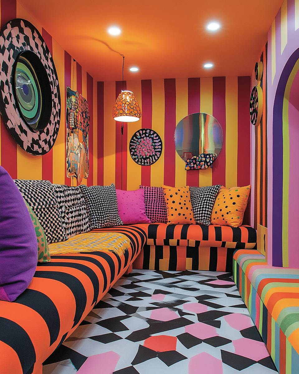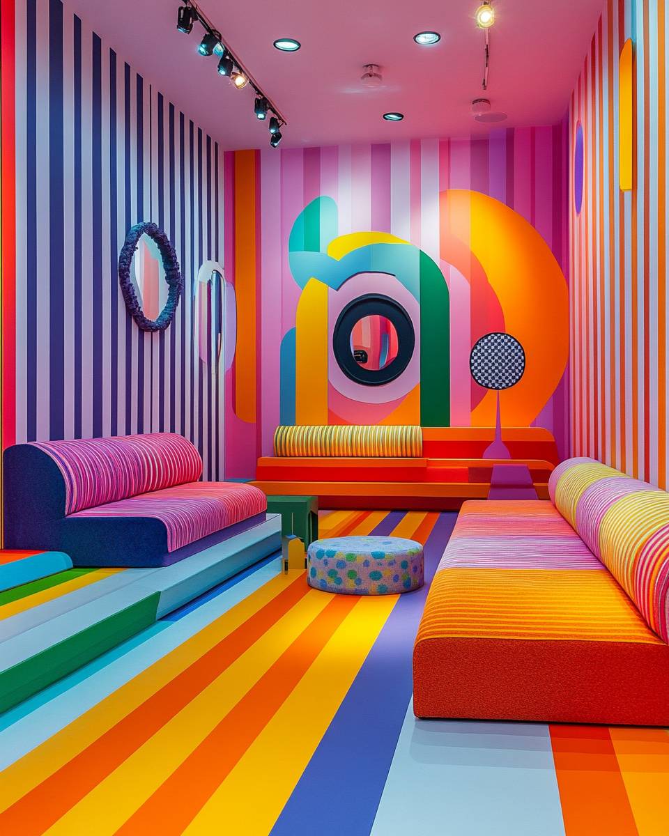 A vibrant and colorful room featuring striped wallpaper in shades of orange, pink, yellow, red, purple, green, blue, white, and black, with geometric patterns on the walls, and playful furniture in bold colors like neon pinks or bright yellows. The style is focused on pattern-based design and precision, reminiscent of the precisionist art movement. --ar 103:128 --stylize 250 --v 6.1