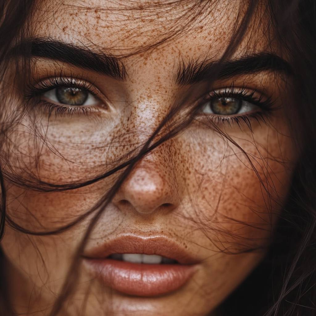 Uma mulher bonita com cabelo cobrindo seu rosto, close-up com os olhos em foco.