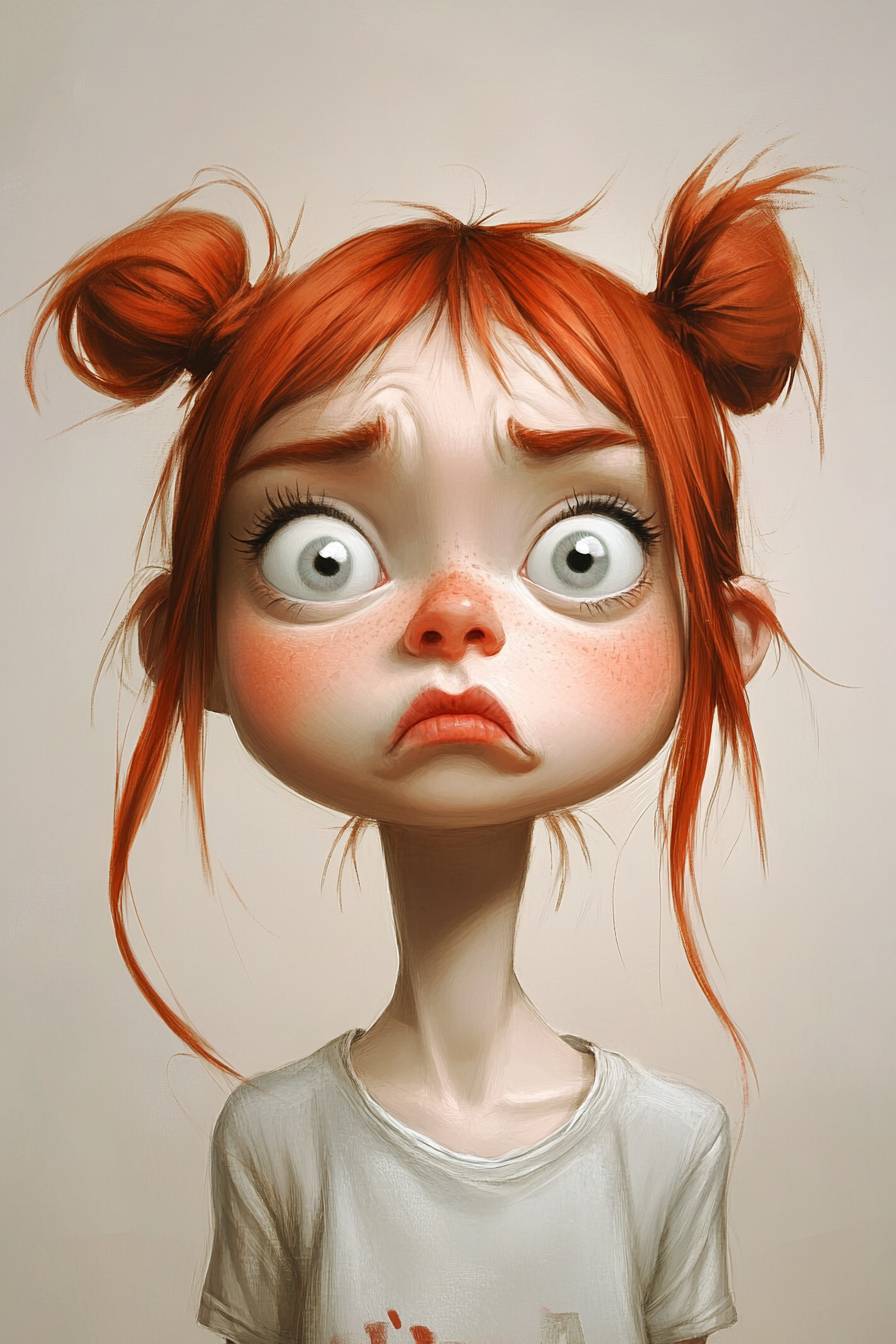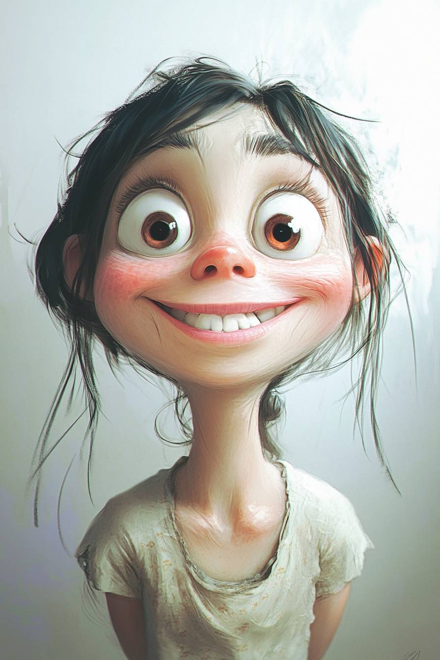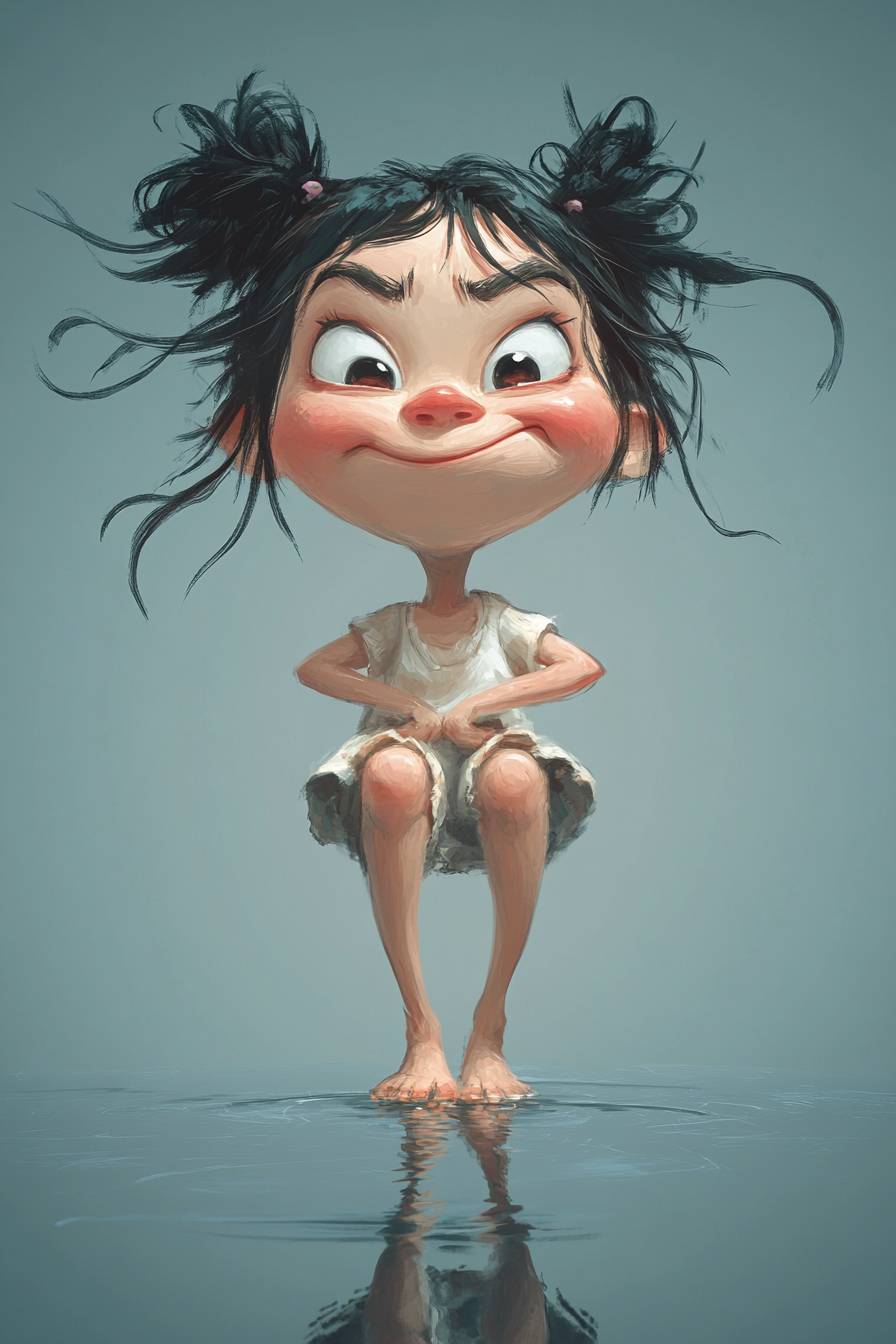 Uma animação de uma menina com um rosto engraçado, misturando vários estilos artísticos para exibir designs de personagens de desenho animado ricos e coloridos.