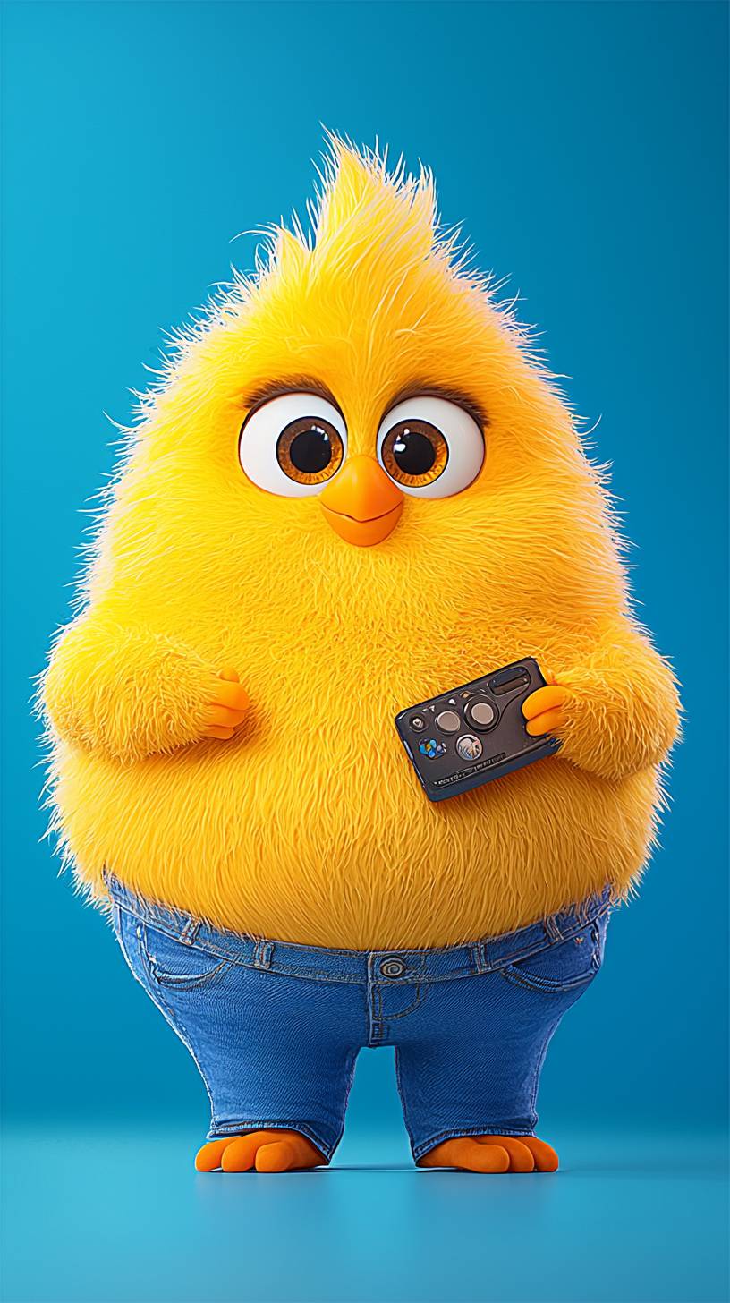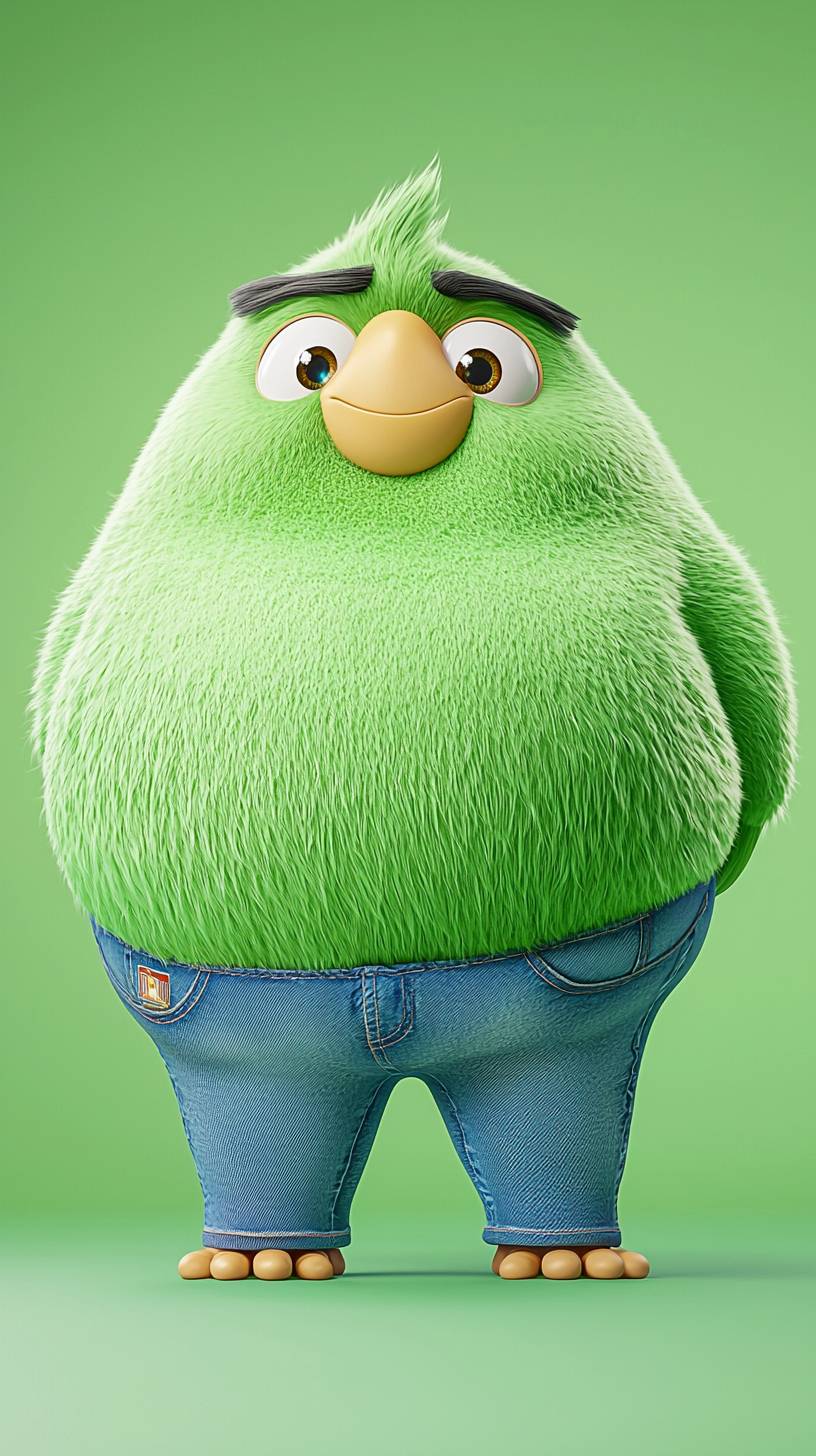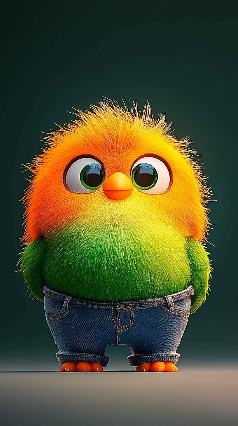 Cute little Chick Parrot, with a big belly, wearing a t-shirt and jeans, big eyes, in the style of Pixar, high-definition photography. --ar 9:16 --quality 2 --personalize 1pan7oc --stylize 750 --v 6.1