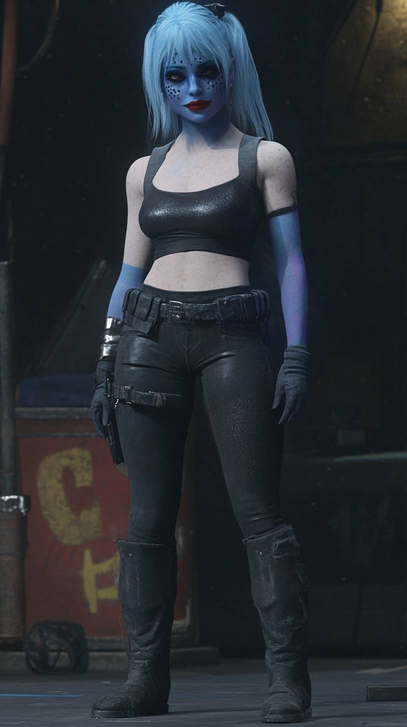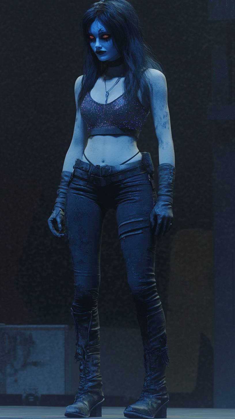 Uma garota de anime em uma blusa cintilante e calças de couro, usando botas de plataforma e maquiagem ousada, de pé sob as luzes do palco.