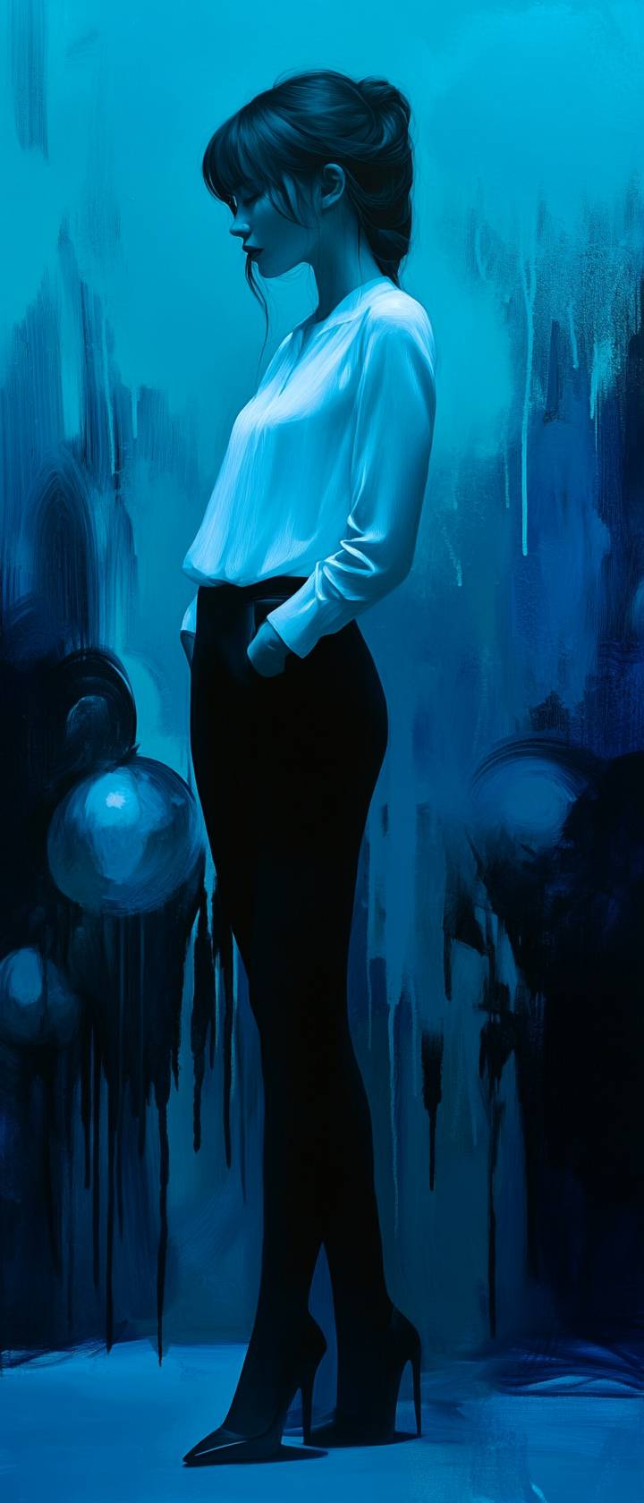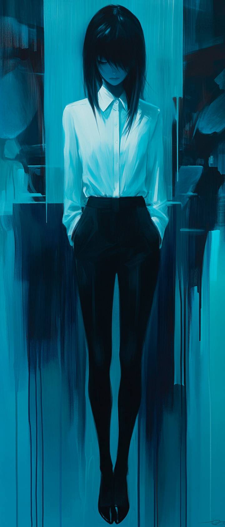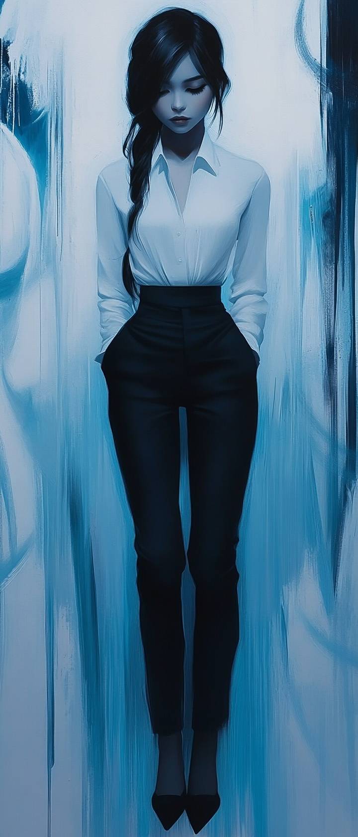 Uma garota de anime com uma blusa branca minimalista e calças pretas, usando mocassins, em um ambiente de escritório limpo.