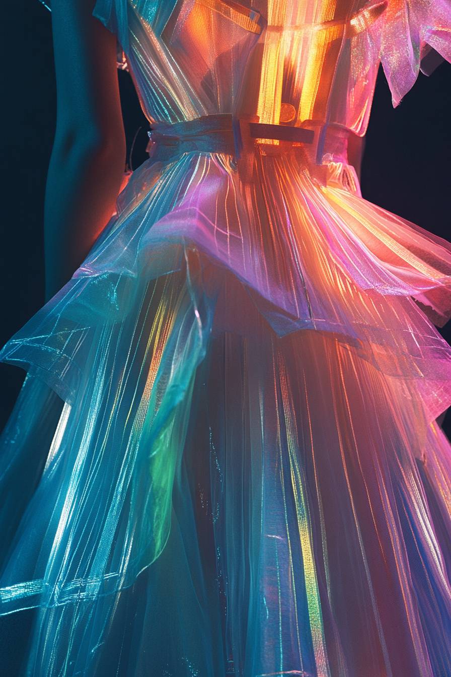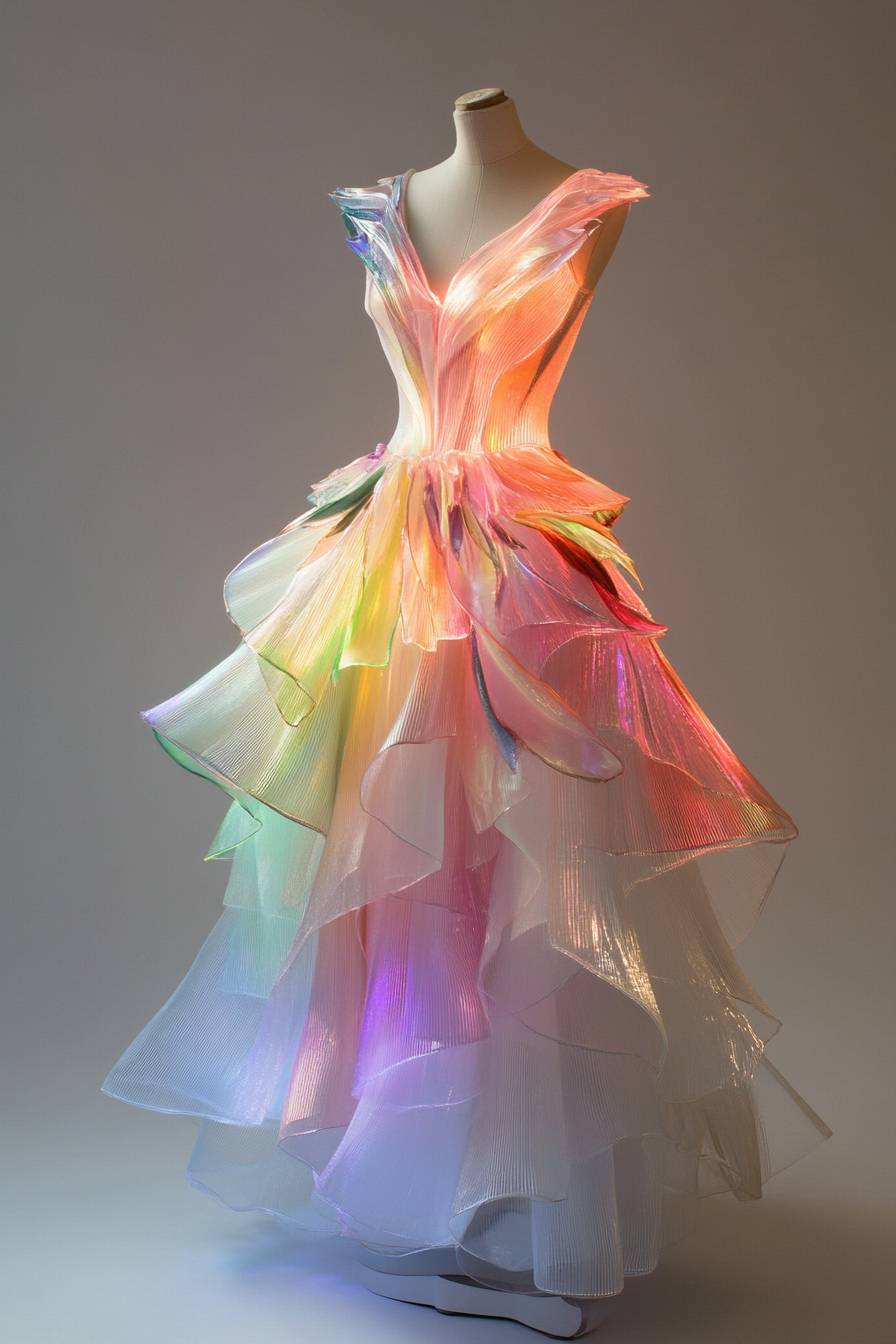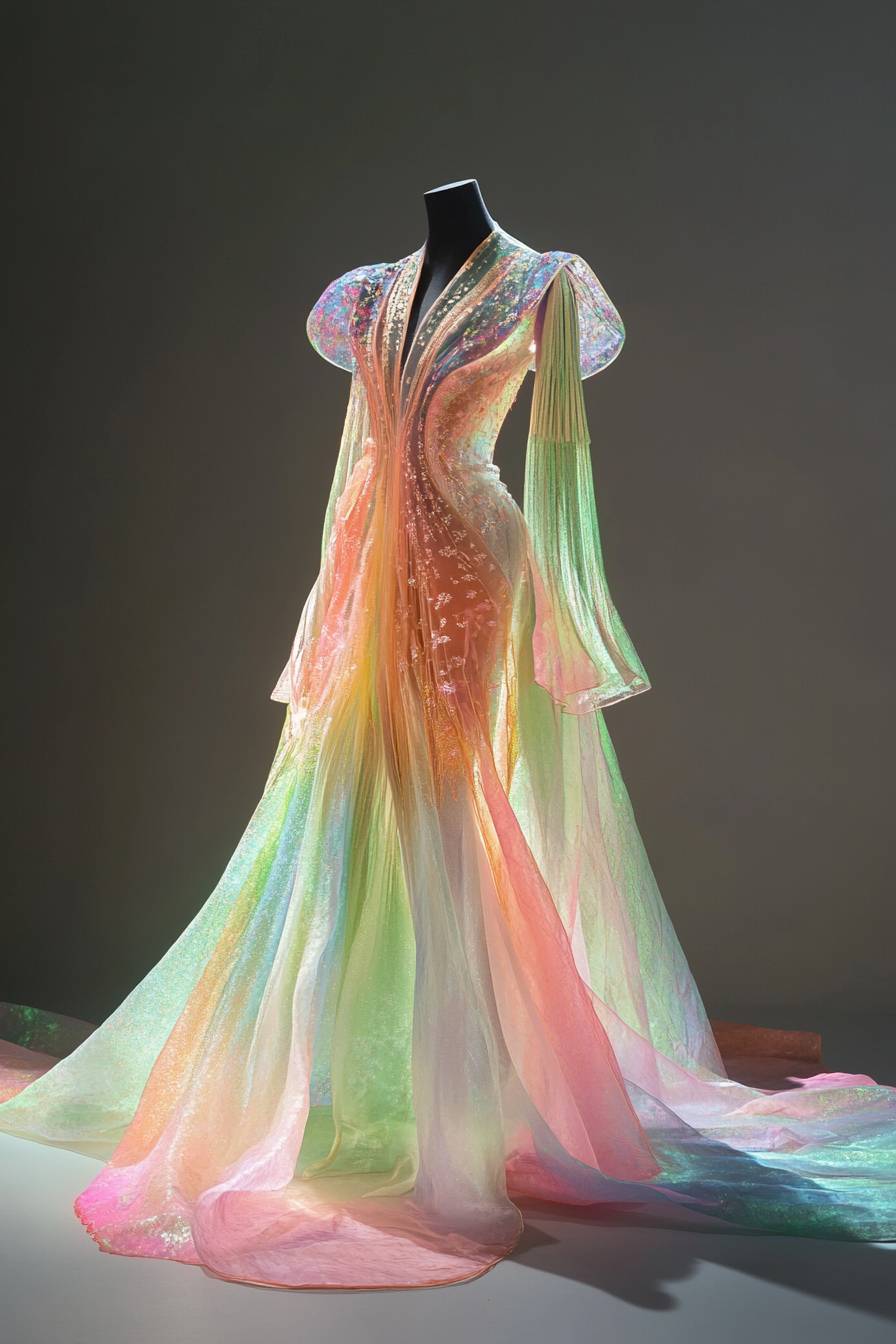 Vestido de alta-costura futurista em cores translúcidas
