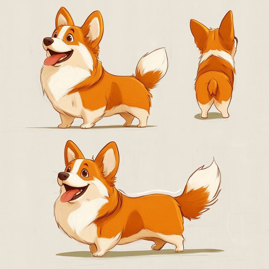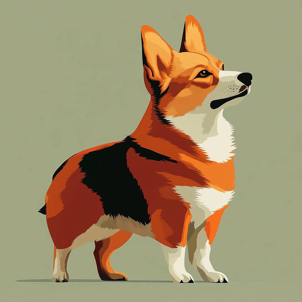 Uma ilustração simples de um corgi laranja em pé sobre as quatro patas, mostrando sua personalidade em uma vista lateral 2D com o corpo inteiro.