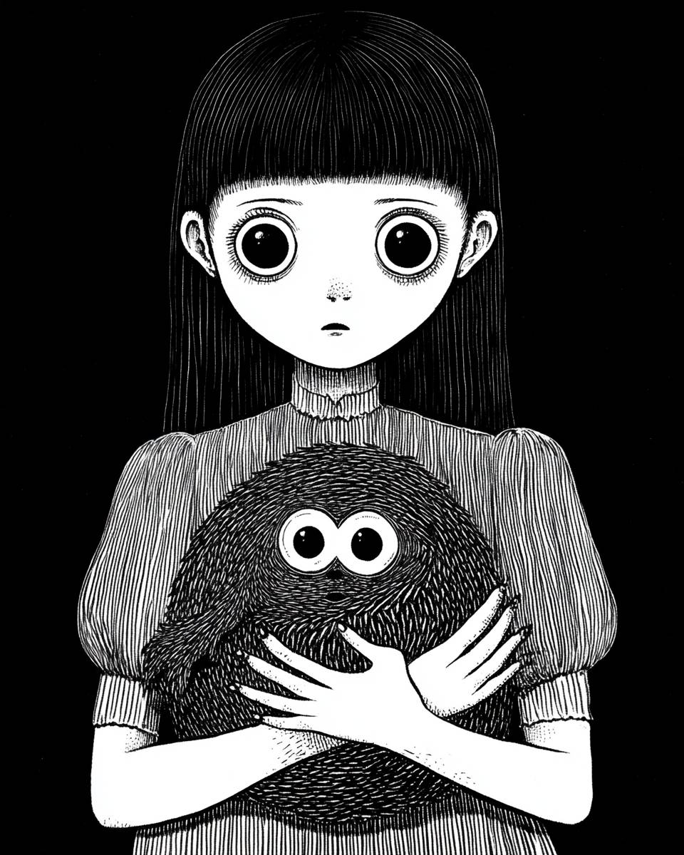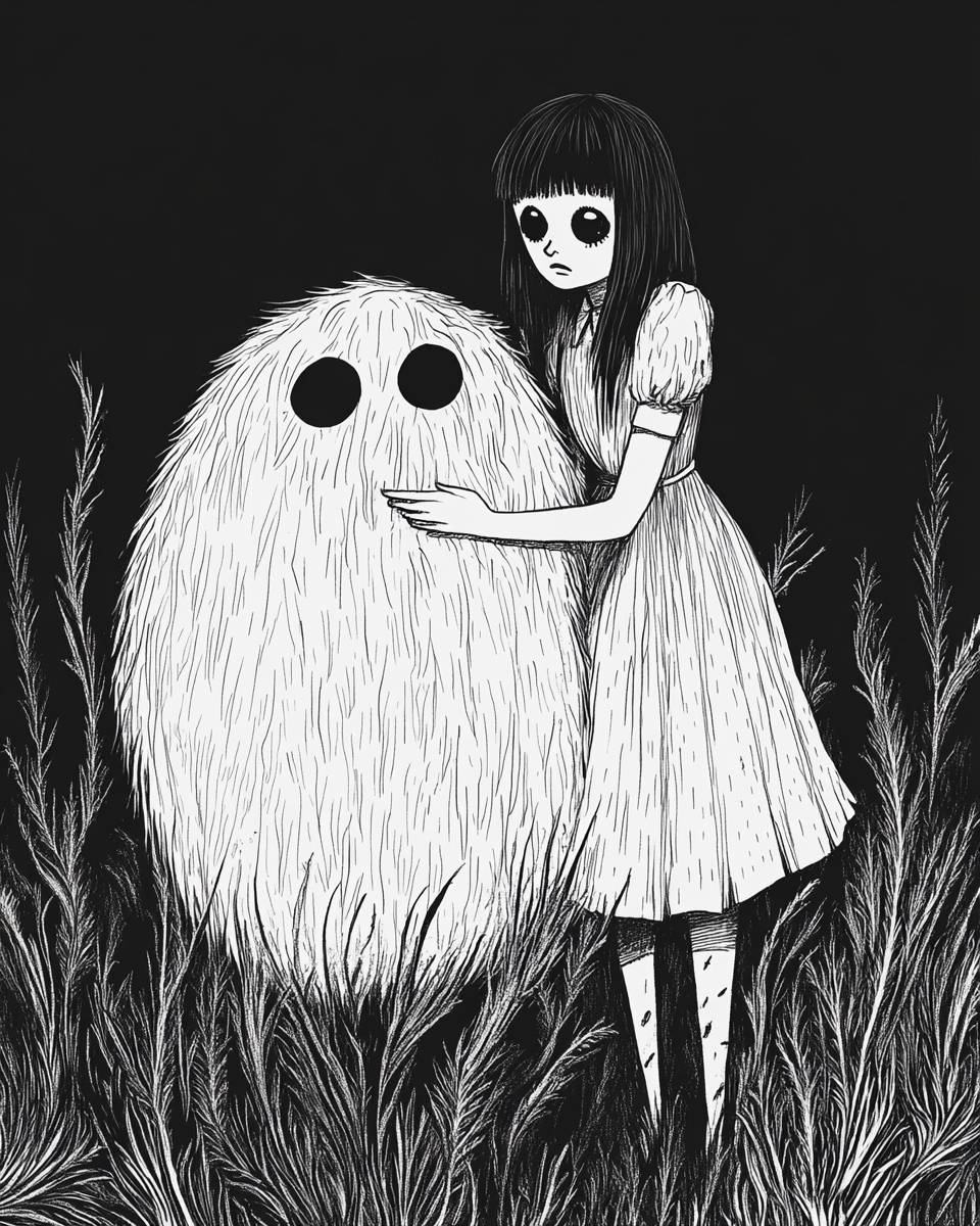 Ilustração de Edward Gorey, estilo de design gráfico arrojado, uma garota creepy cute tem um blob de estimação, em preto e branco, com fundo preto.