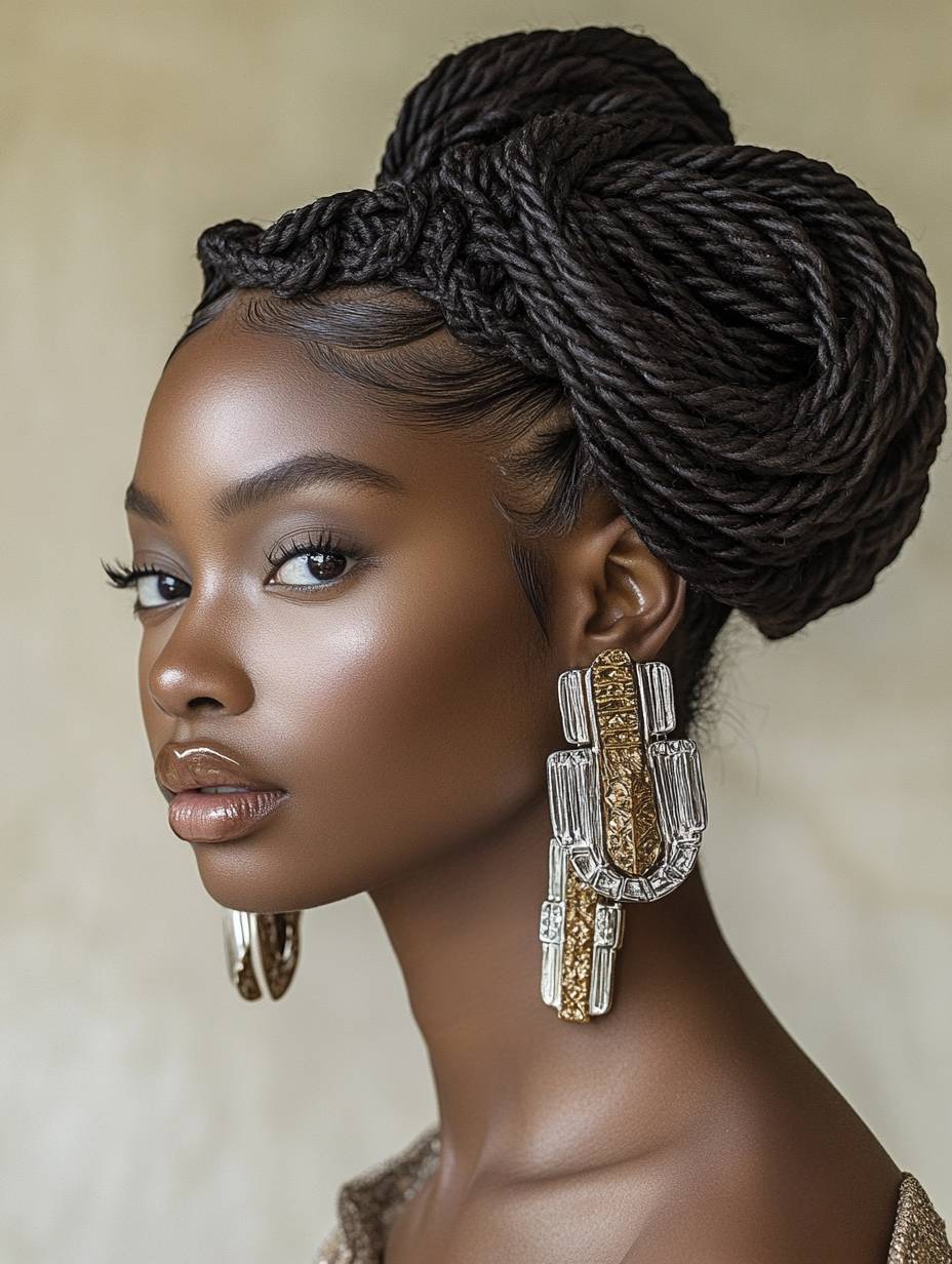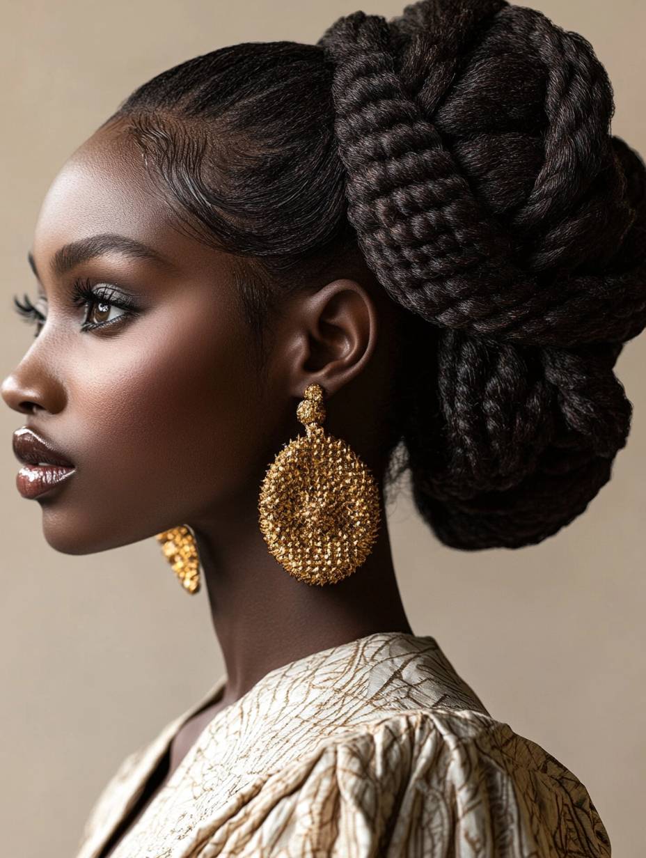 Uma modelo exibe um penteado natural em um elaborado coque trançado, complementado por brincos oversized inspirados no design arquitetônico.