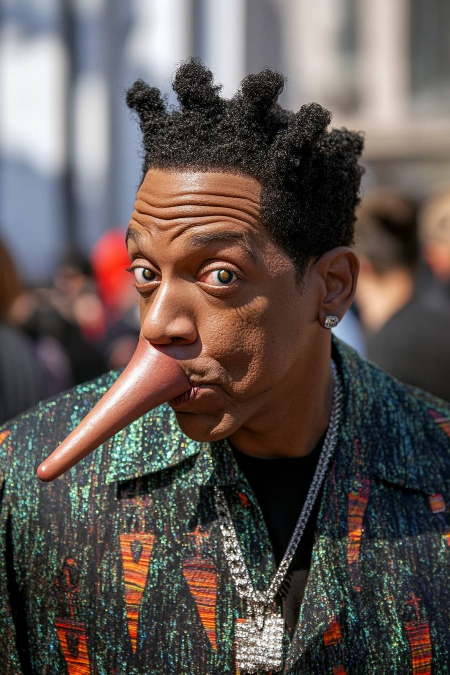 Foto de Jay Z com um nariz longo, semelhante ao Pinóquio.