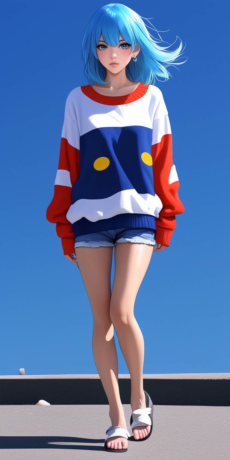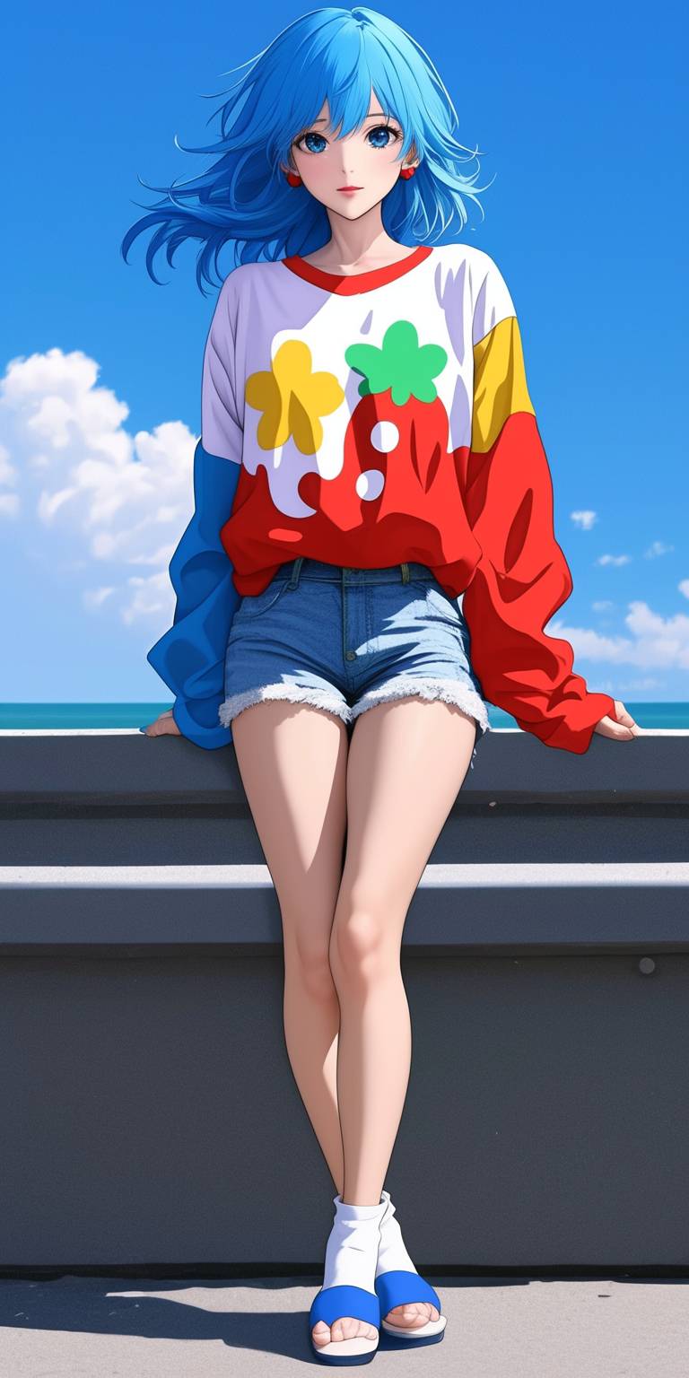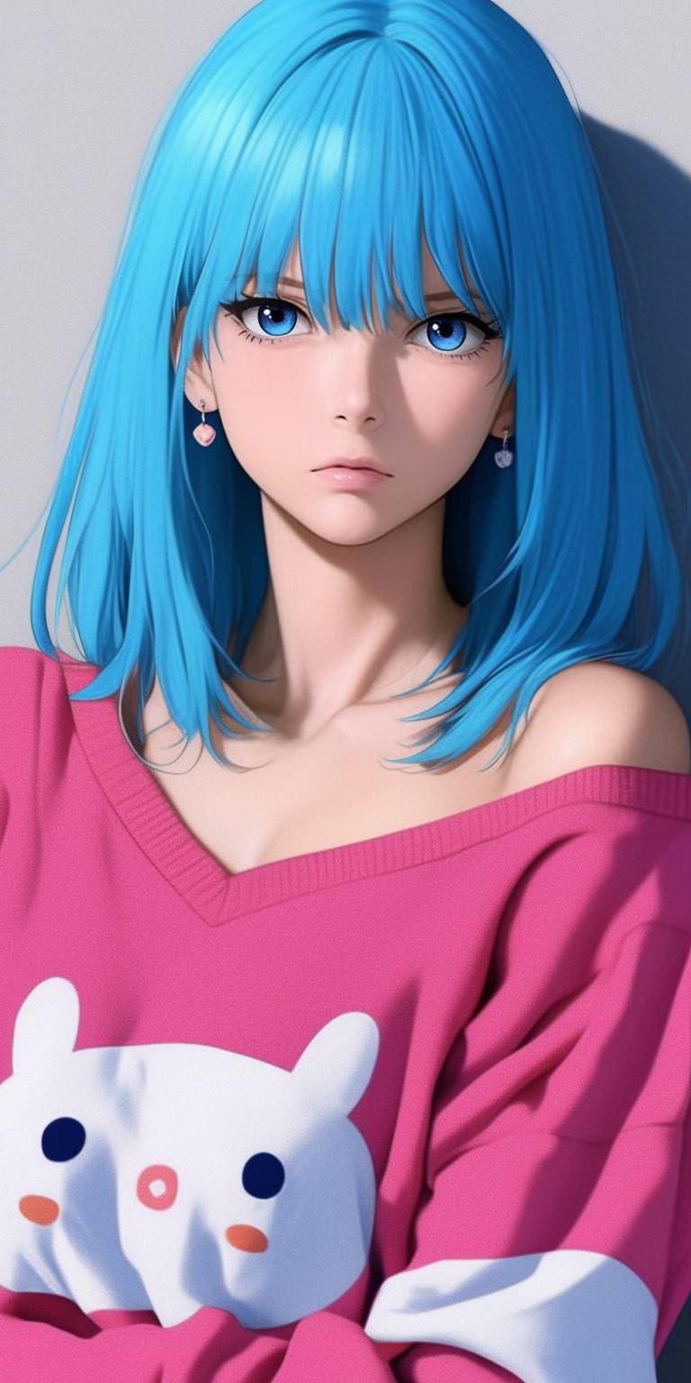 Realistic 2D anime style, featuring a cute, stylish character inspired by Japanese kawaii culture. The character has short, light blue hair and large expressive eyes, dressed in casual but trendy clothing, including an oversized pastel sweater with a cute bunny print, paired with denim shorts and flip-flops. The character is front-facing, with a playful pose, set against a background of a charming Japanese bakery designed in kawaii style. The bakery has pastel-colored walls, rounded windows, and cute decorations like a giant strawberry on the roof. The setting exudes a cozy and whimsical atmosphere, with the character captured from a medium low-angle perspective, fashion theme, dynamic poses, --ar 1:2 --style raw --sref 1756407114::1 104440089::0.3 2608178059::1 --personalize amyktcr --stylize 400 --niji 6