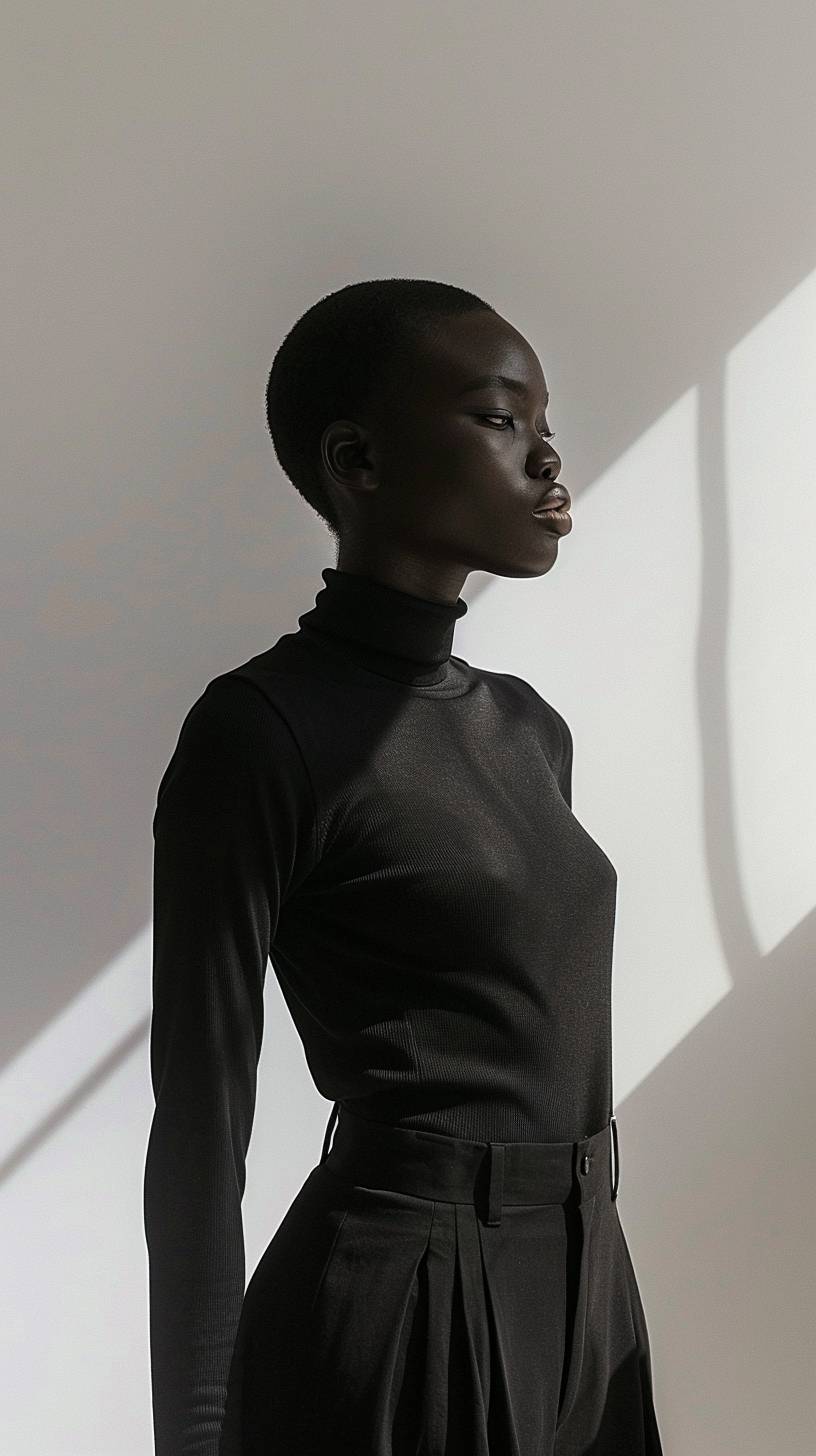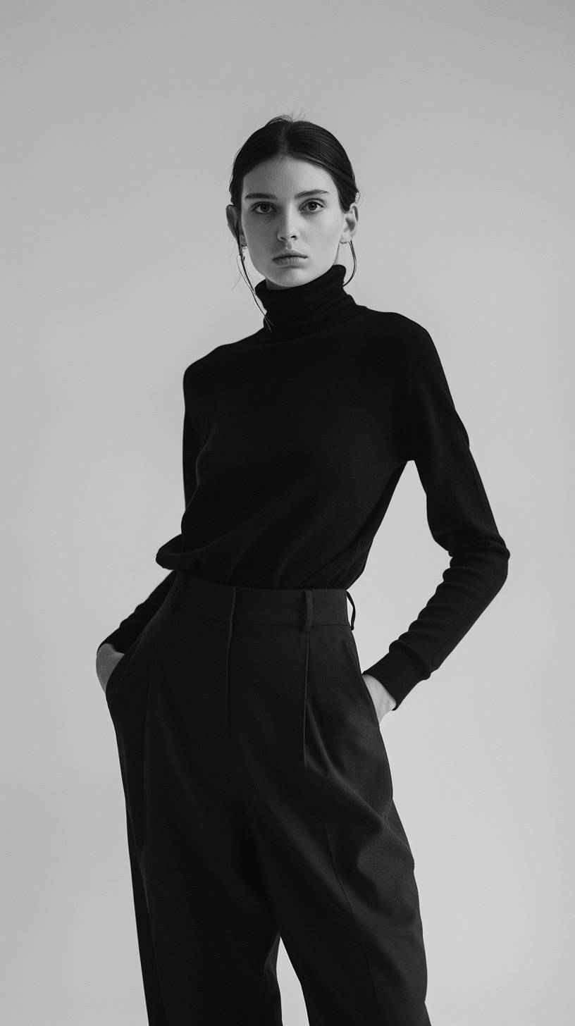 Model in a minimalist outfit consisting of a sleek black turtleneck and high-waisted trousers, positioned against a white background to contrast the simplicity and elegance of the attire. --ar 9:16 --v 6.0