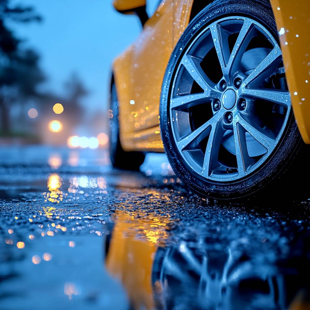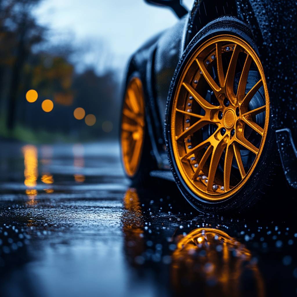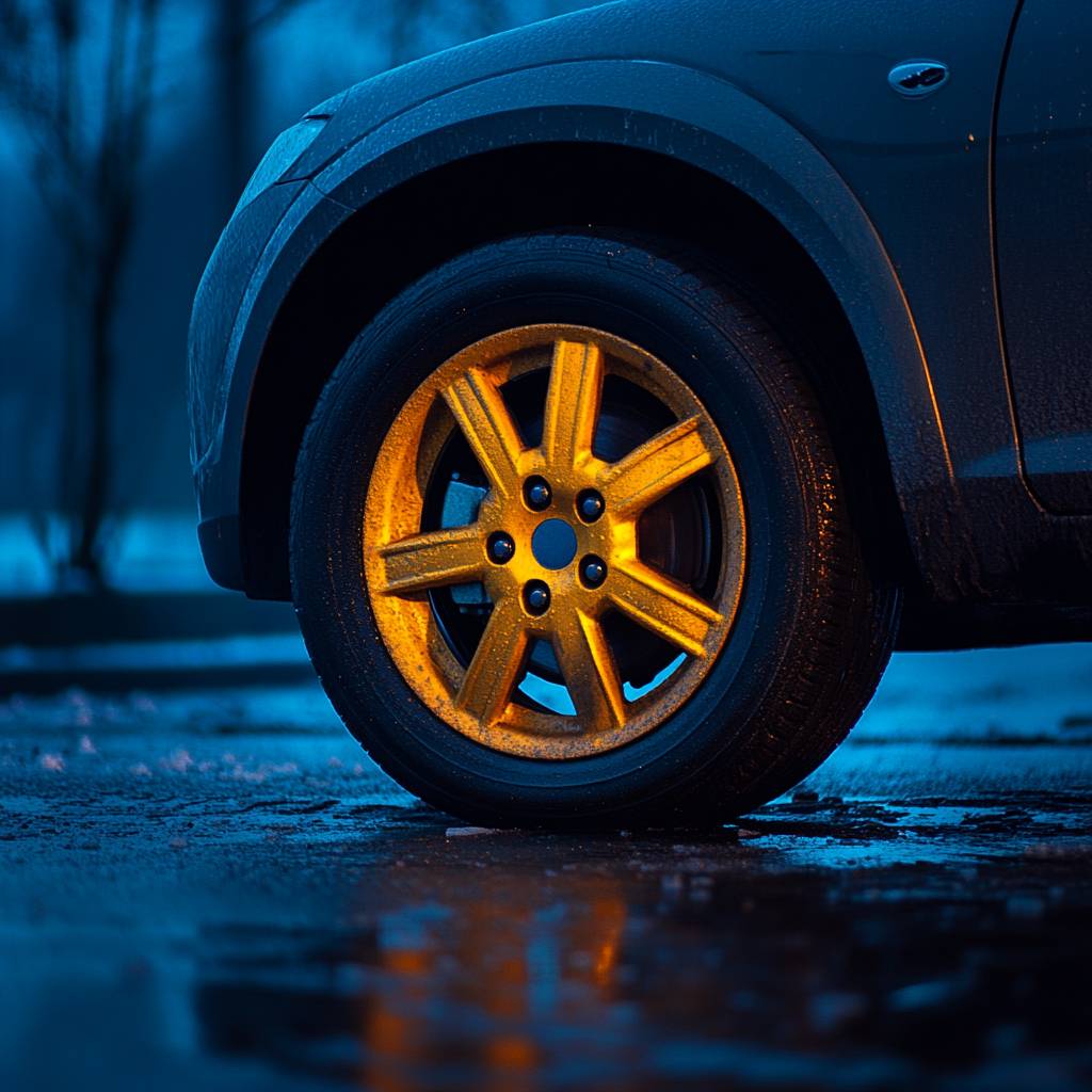Uma roda de carro amarela em um fundo de asfalto escuro.