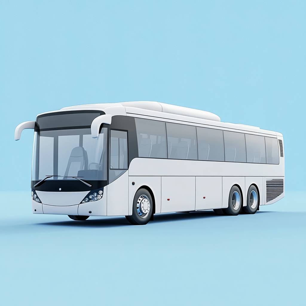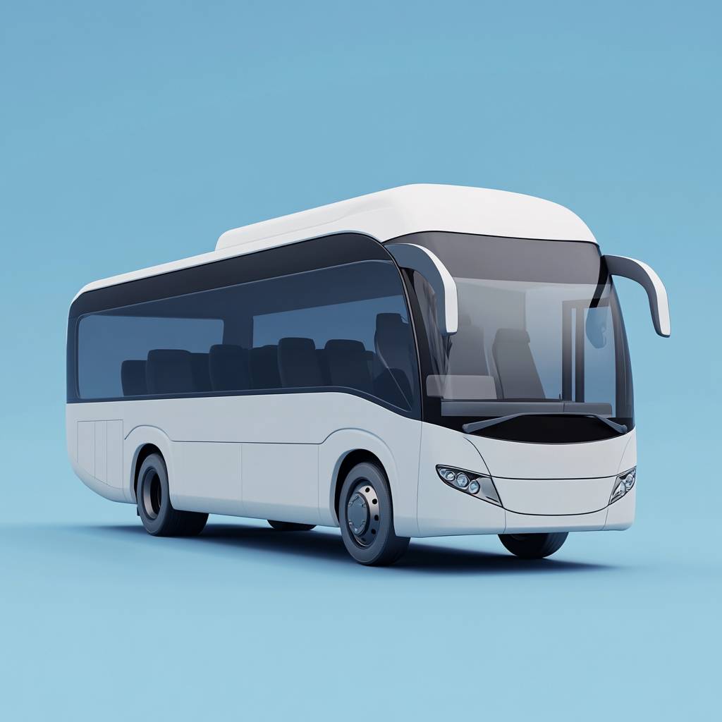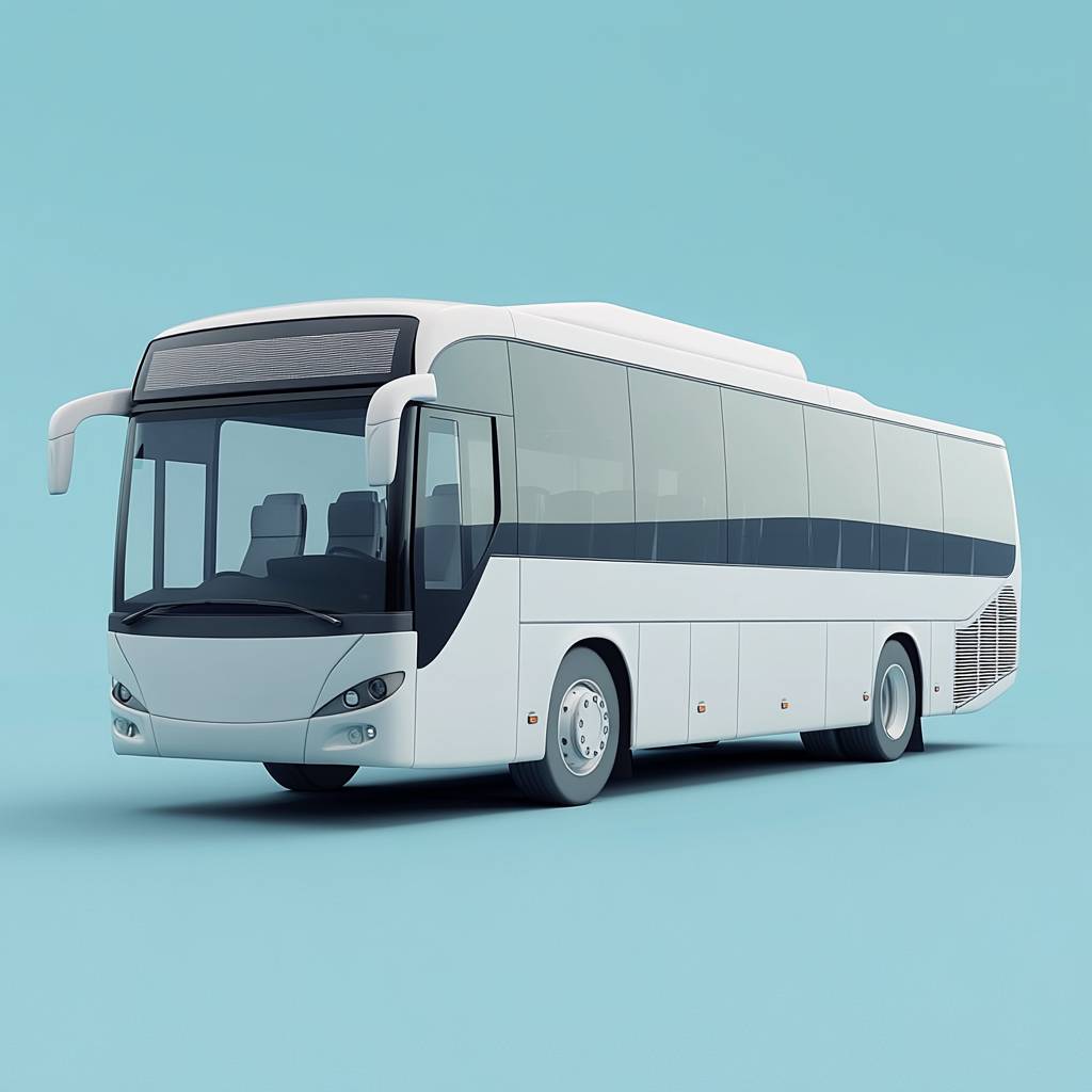 Uma renderização 3D de um ícone de ônibus grande e um ícone de carro branco sobre um fundo azul claro em um estilo minimalista, com detalhes claros na parte frontal e uma sensação tecnológica.