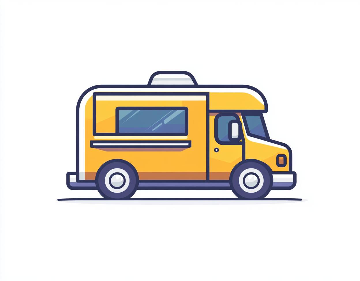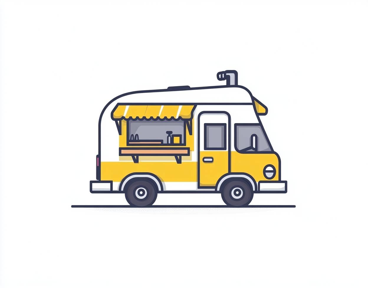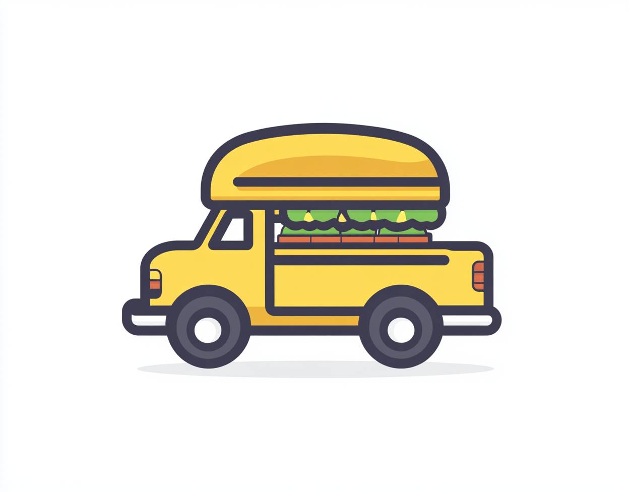 Logotipo de um caminhão de comida, estilo vetorial, design simples, fundo branco, paleta de cores amarelas, estilo de desenho animado, arte vetorial, linhas sólidas, preenchimento sólido, sem sombreamento em gradiente, sem sombras, design plano, design simples, sem detalhes apenas no lado esquerdo, sem sombreado ou gradientes, fundo branco isolado.