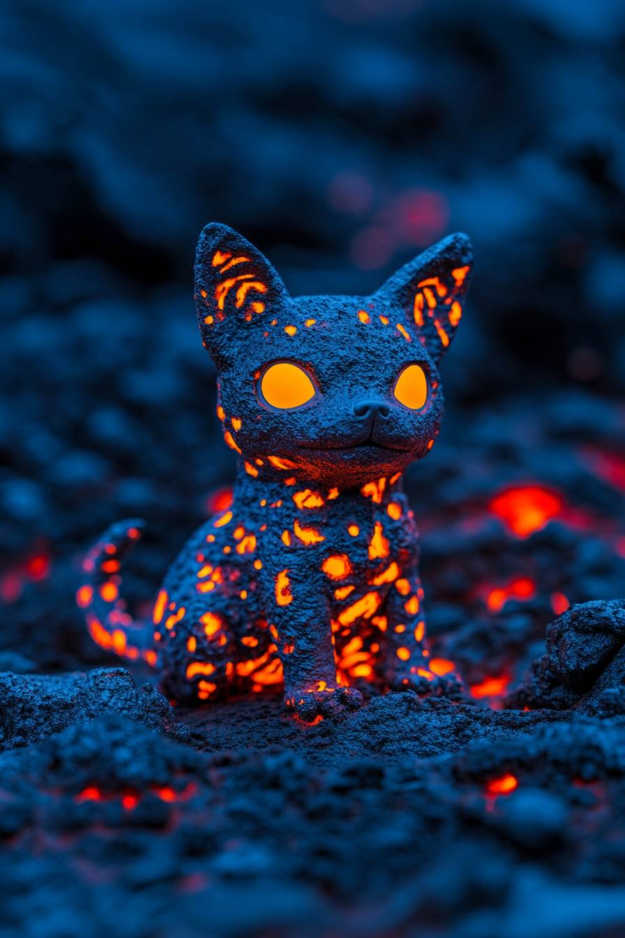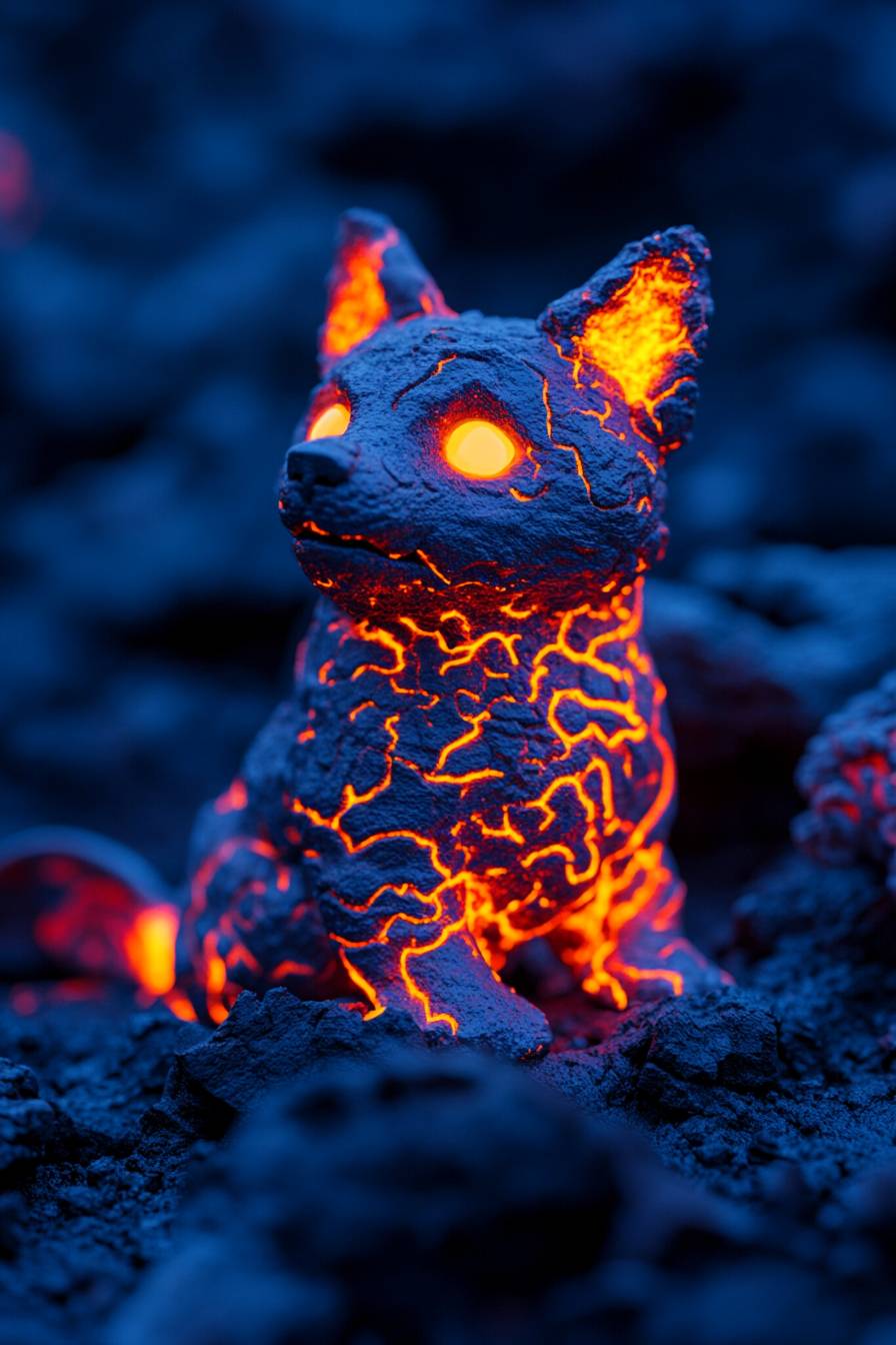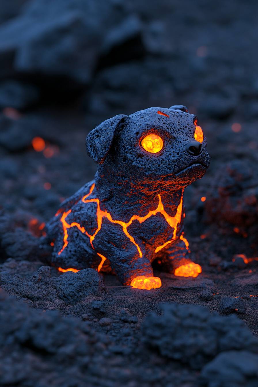 Ultra-realistic, high-detail 8K photograph of an adorable alien canine adapted to a fiery, molten world. The creature has a compact, rounded body with soft, glowing scales in vibrant shades of red, orange, and gold, resembling cooling lava patterns. Its large, expressive eyes shimmer like molten amber, radiating warmth and curiosity. Rounded, heat-resistant ears tilt playfully, while its small, glowing paws leave faint, harmless trails of light as it walks. The tail curls slightly, glowing softly like a cooling ember, and bio-luminescent patterns pulse gently across its body, creating a soothing, rhythmic glow. Despite the intense environment, its demeanor is playful and affectionate, sitting amidst volcanic rocks and glowing rivers of lava, perfectly at home yet irresistibly cute. --ar 2:3 --style raw --personalize 7kg1nej --v 6.1