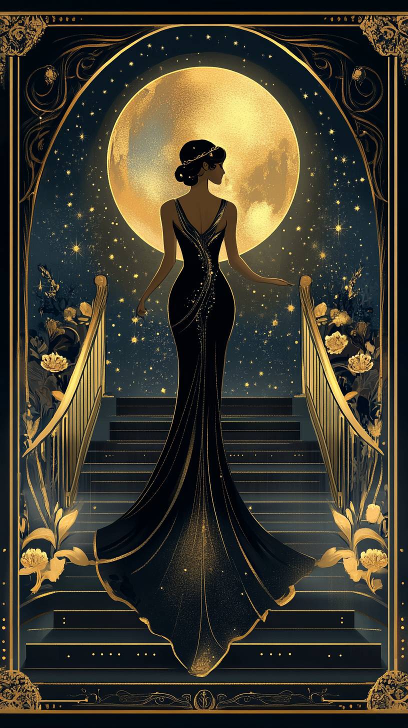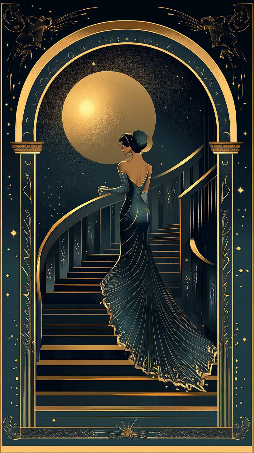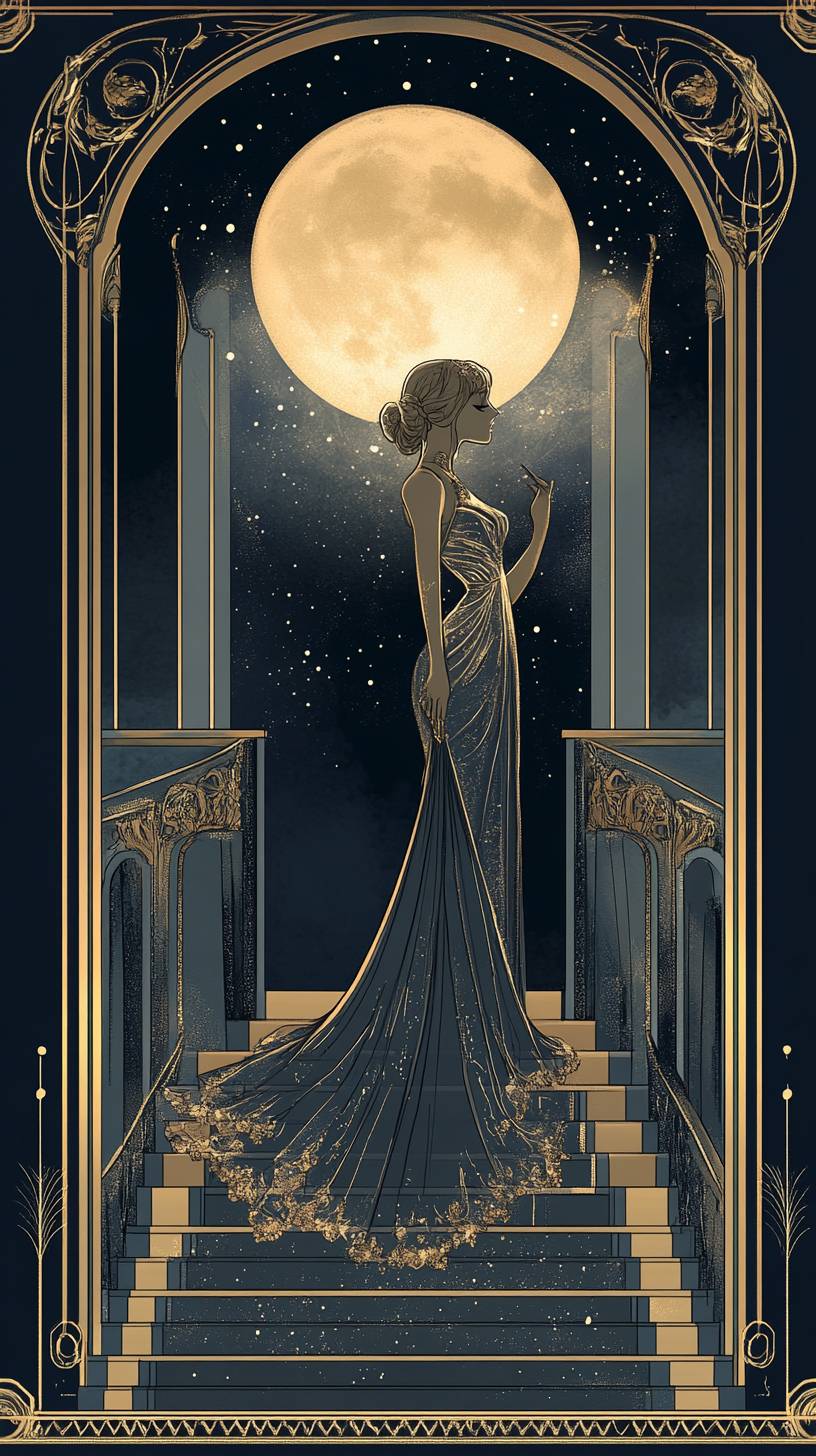 Uma linda mulher em um vestido de estilo Art Déco está de pé na escada, emoldurada por arcos decorativos e cercada por uma lua brilhante, criando uma atmosfera luxuosa.