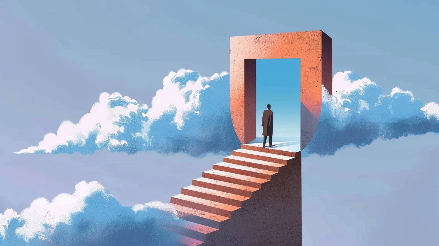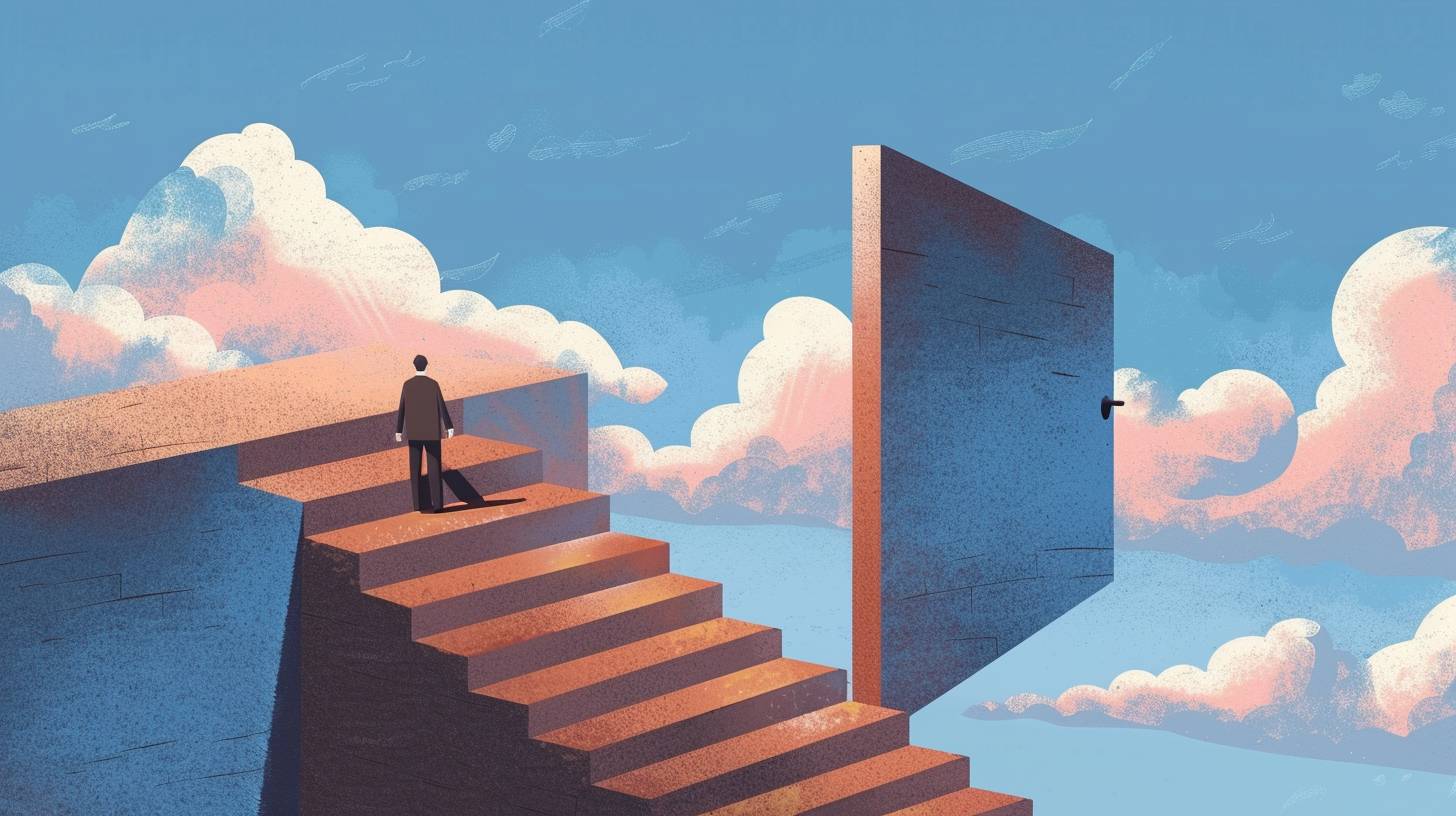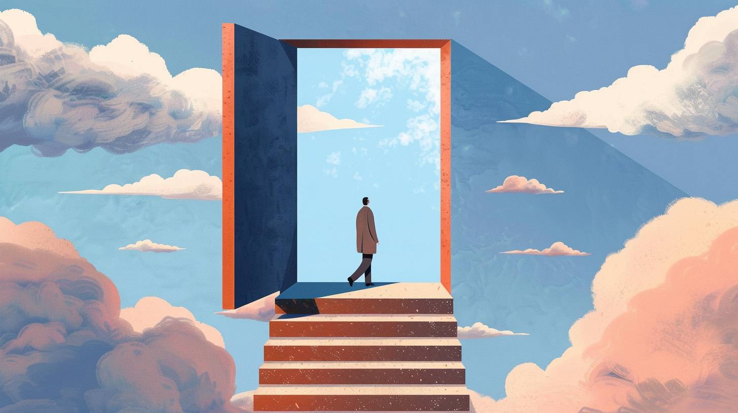 A person walking up the stairs of an open door leading to blue sky, symbolizing growth and new beginnings in life. The background is minimalistic with clouds, creating a serene atmosphere. The colors used for illustration include shades of gray, beige, brown, light pink, white, greyblue, navy blue, and orange accents. It has flat design elements and geometric shapes, giving it a modern feel, (openai style) --sref <https://s.mj.run/IIjndZ1McVU> --ar 16:9 --v 6.0