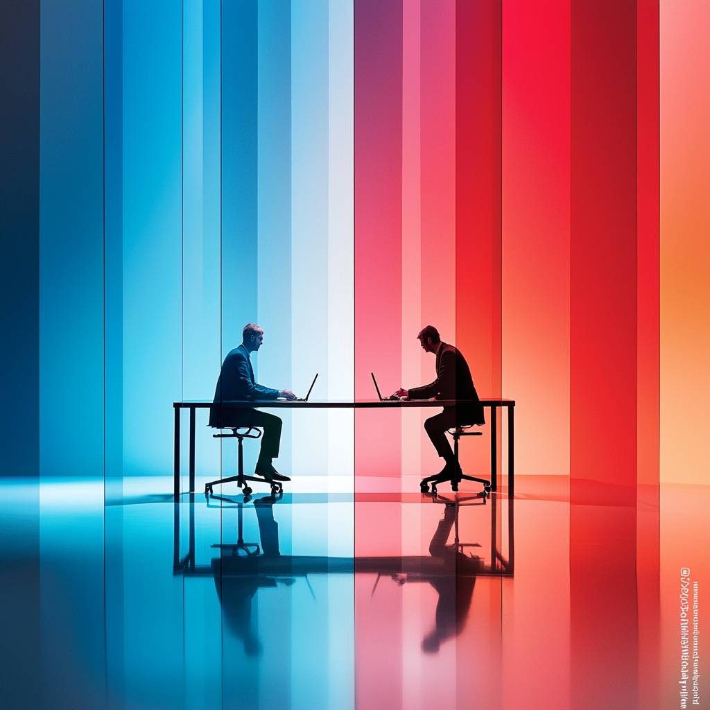Uma cena de negociação tranquila com sobreposições em tons pastel que destacam as conexões emocionais.