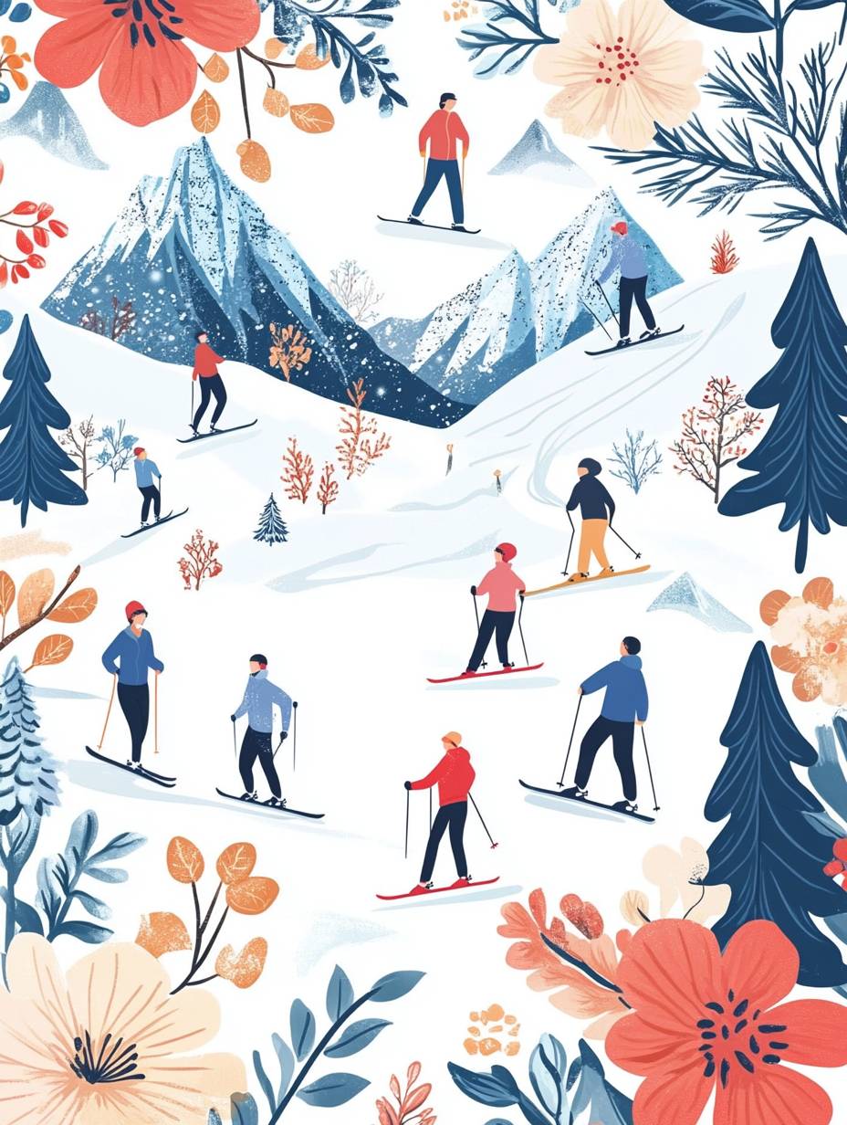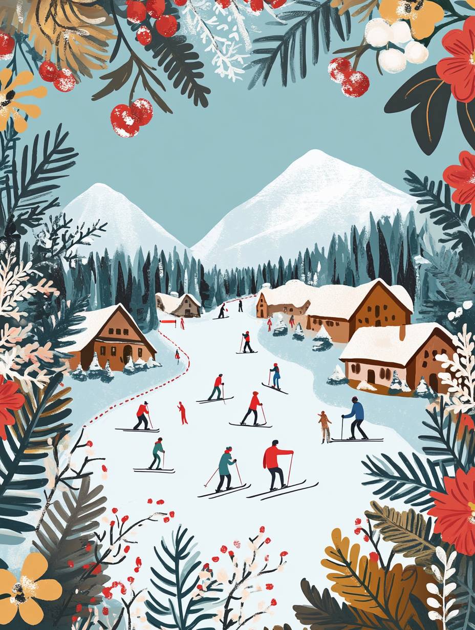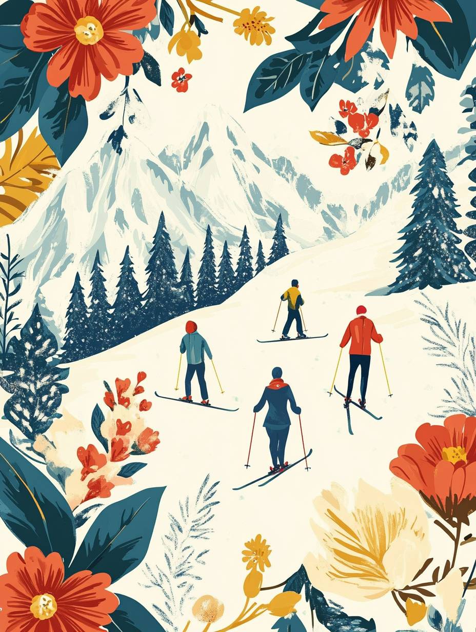 Vector pattern, elegant and fresh, surrounded by snowy mountains, skiing, people, flowers around the corners,best quality, different color, Strong contrast --ar 3:4 --style raw --v 6.1