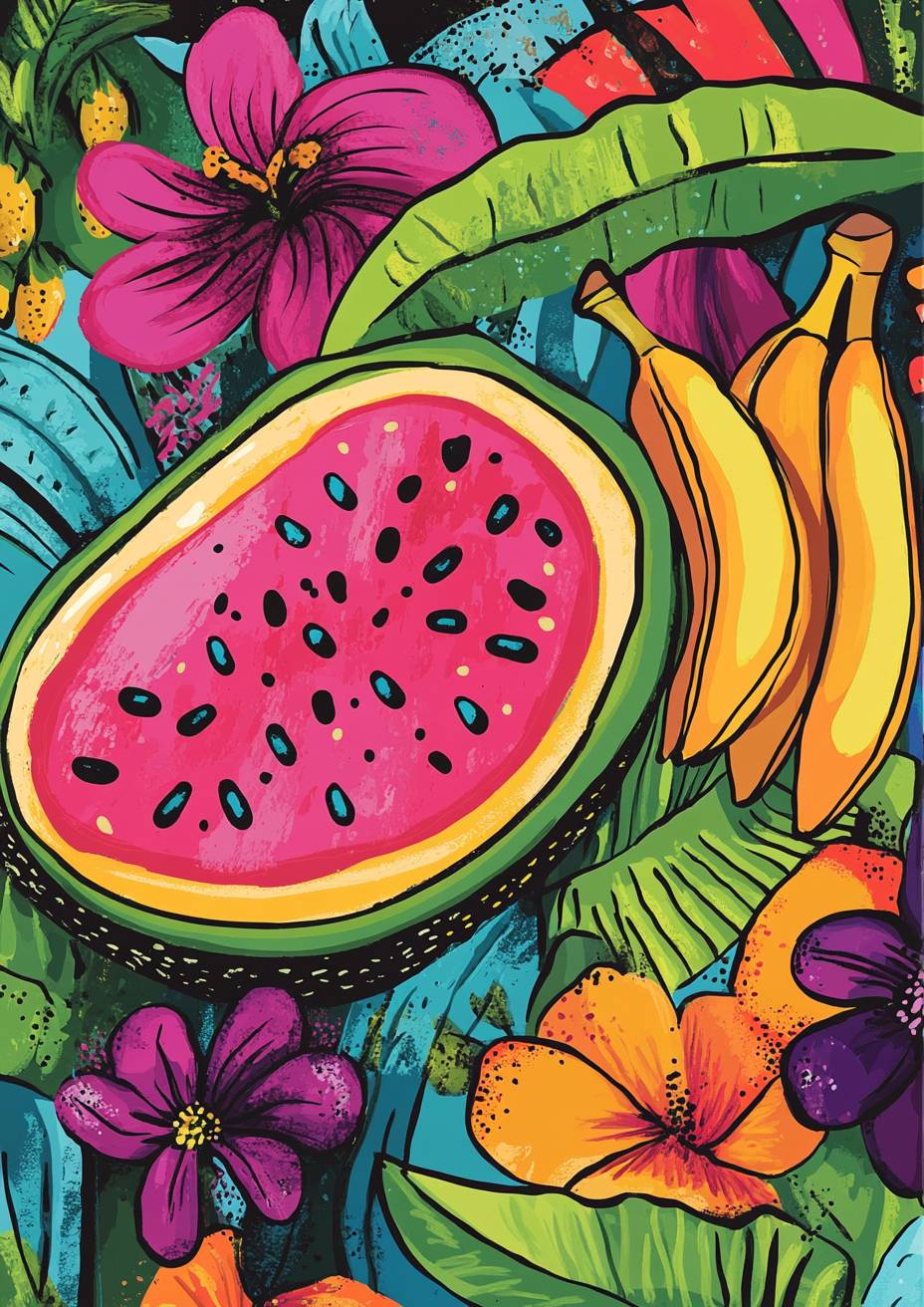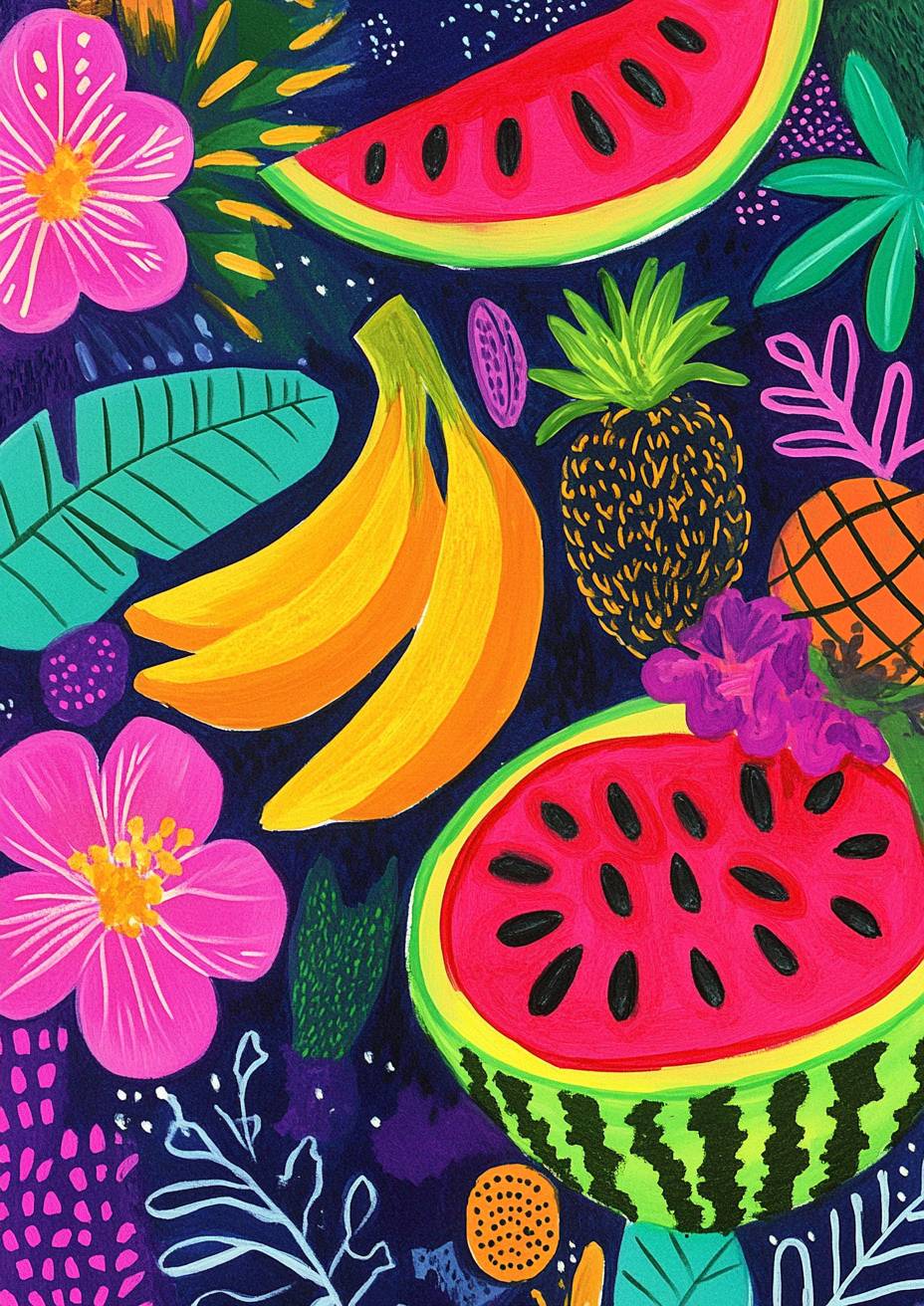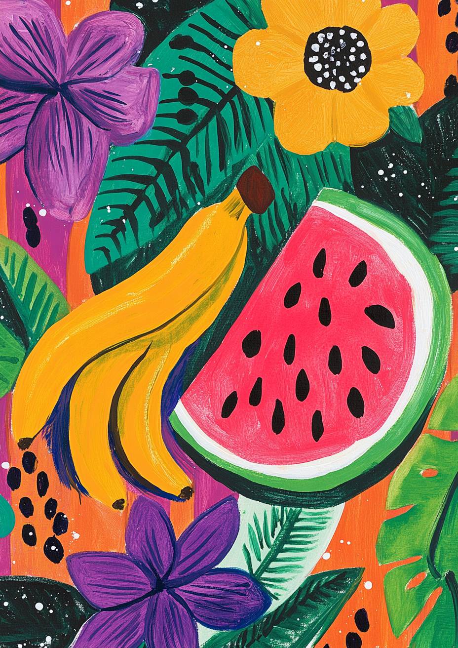 A vibrant, colorful illustration of tropical fruits and flowers in bold colors like pink watermelon, green bananas, and purple hibiscus, with hand-drawn elements and doodles, in the style of Henri Matisse, created using gouache and ink. --ar 5:7 --v 6.1