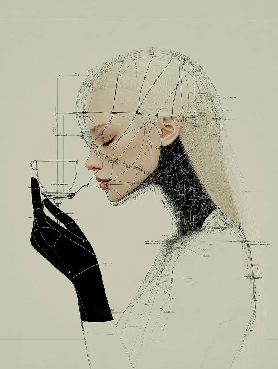 Beautiful Cyborg woman in a cafe where the menu changes based on quantum probabilities. Patrons might order a coffee that could taste like chocolate one moment and lavender the next, or find their food served by waiters who blink in and out of existence due to quantum superposition. --chaos 11 --ar 3:4 --sref 3919836115 --style raw --v 6.1 --stylize 400 --personalize nbqrv1s