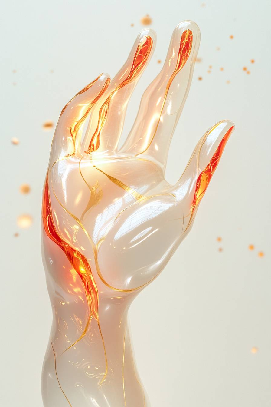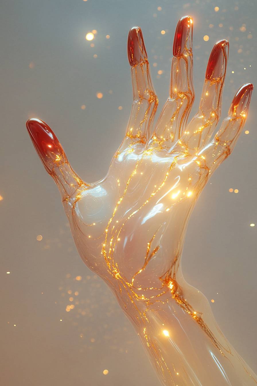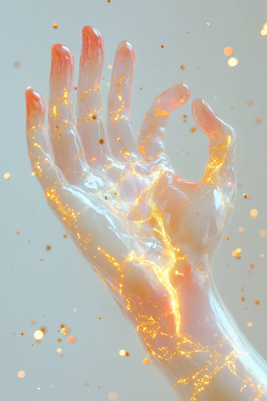 Uma mão sintética levantada em um gesto meditativo, composta de um material semitranslúcido liso com sutis inserções douradas e acentos brilhantes em vermelho e dourado.