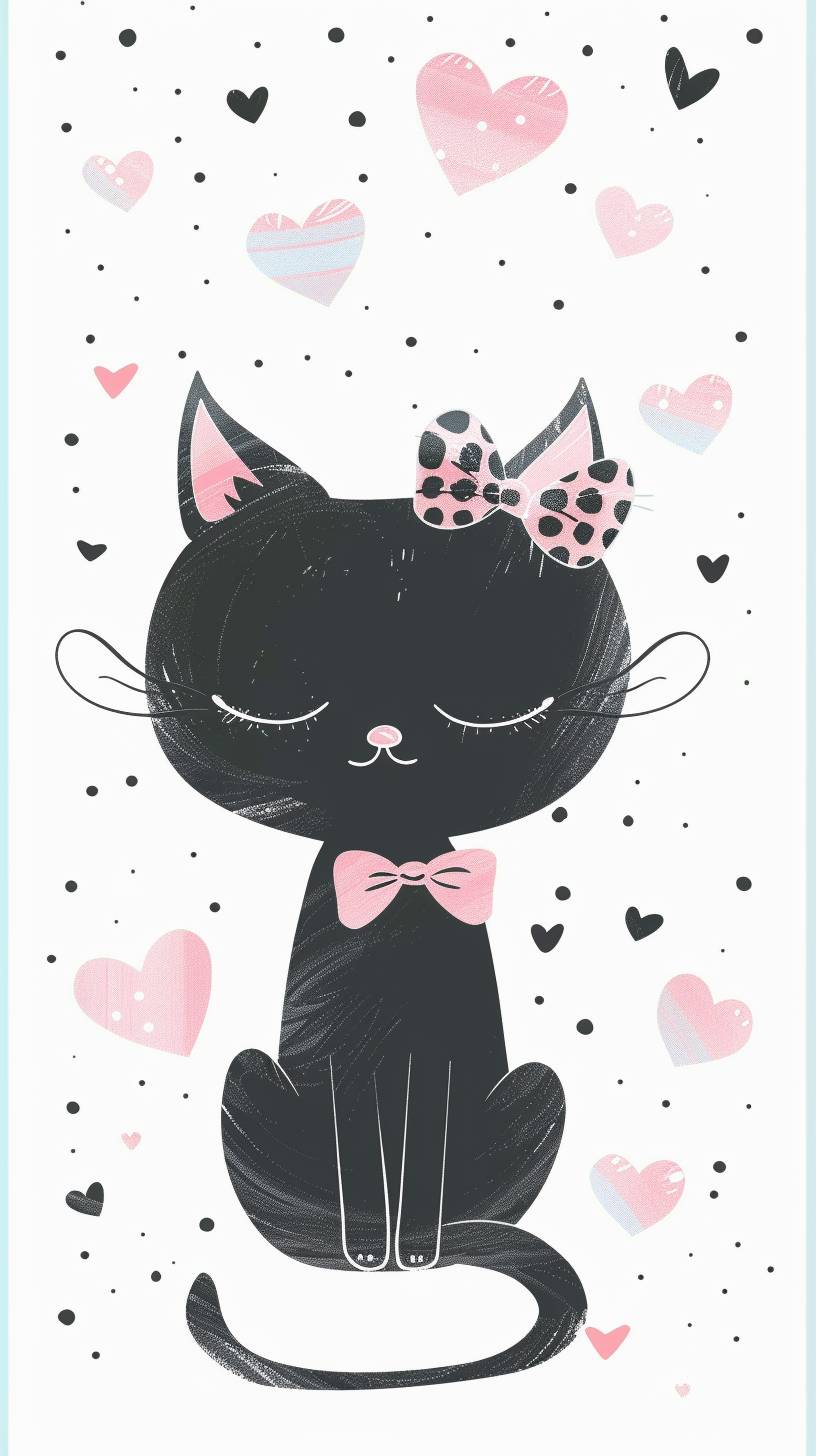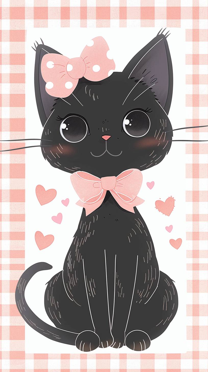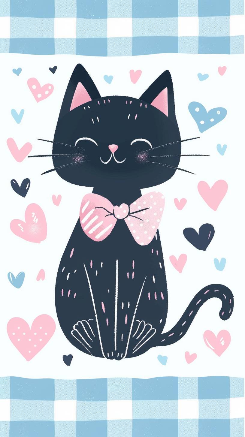 kawaii black cat with pink bow pattern, hearts and gingham patterns, white background, in the style of John Klassen, as a simple vector illustration in a light blue pastel color theme, --ar 9:16 --v 6.0