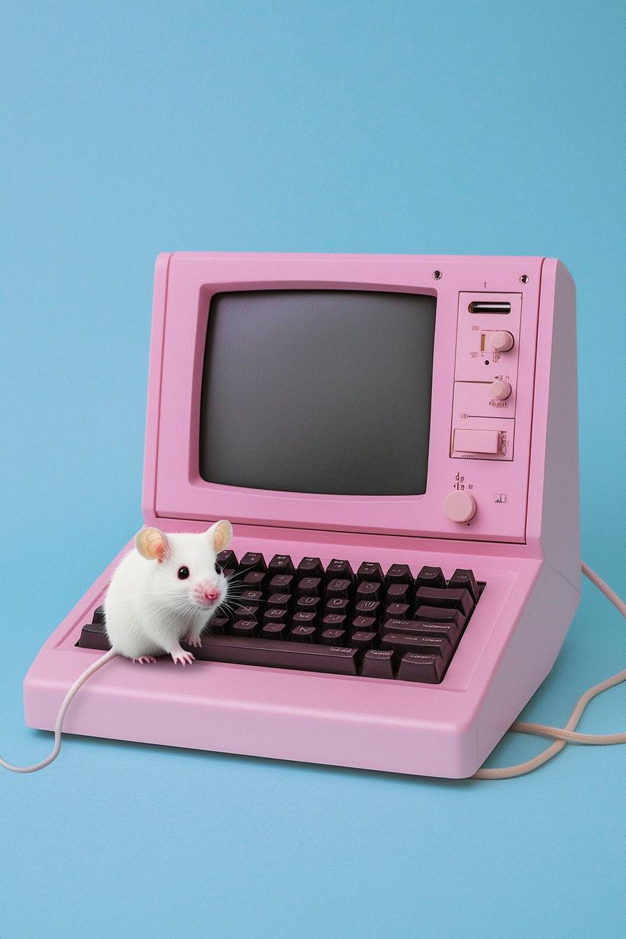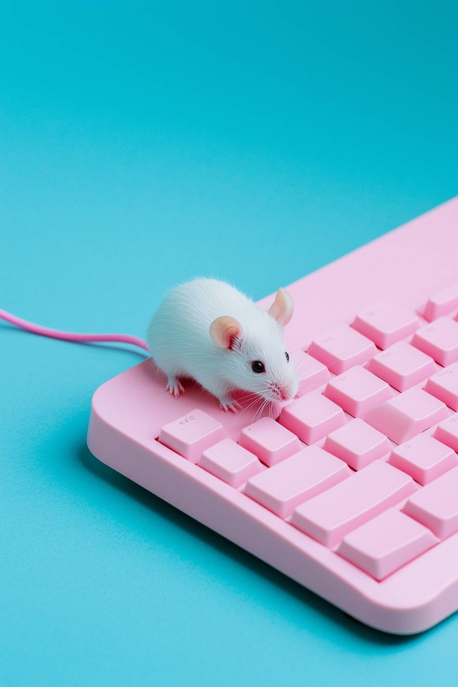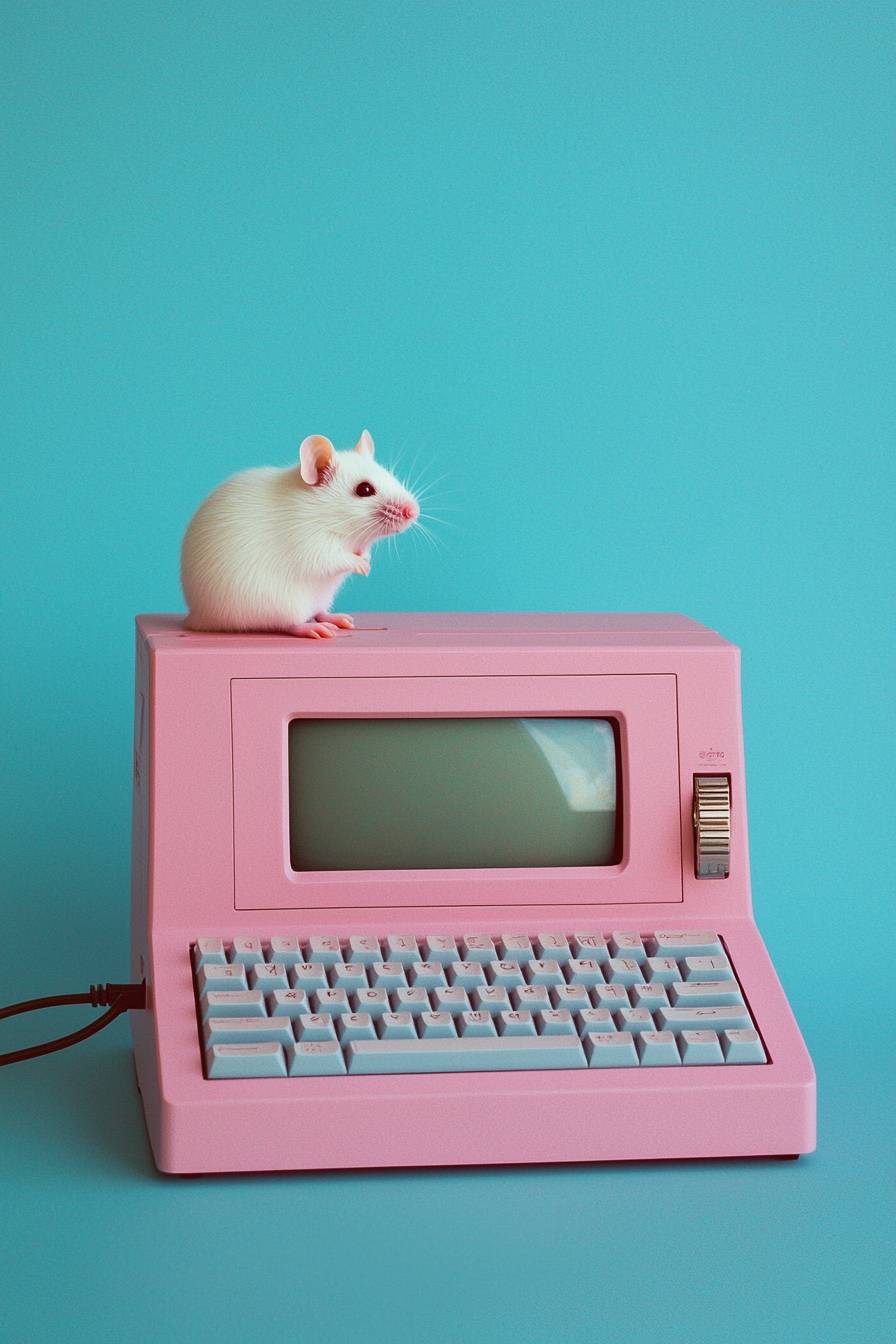 one pink retro computer, mouse pad and realistic live mouse standing on pad on pastel baby blue background, little antrophomorphic mouse sitting on pad, mouse pad is pink, mouse is sitting on mouse pad, mouse is alive and white, real mouse, humor, concept, advertising, desin, copy space, photography style, high resolution, hyper-realistic, super detailed, no shadows, studio lighting, photography, no blur effect, clear focus, high detail, no shadow in the background, natural light, minimalist style, ultra-realism, real photo --ar 2:3 --quality 2 --v 6.1