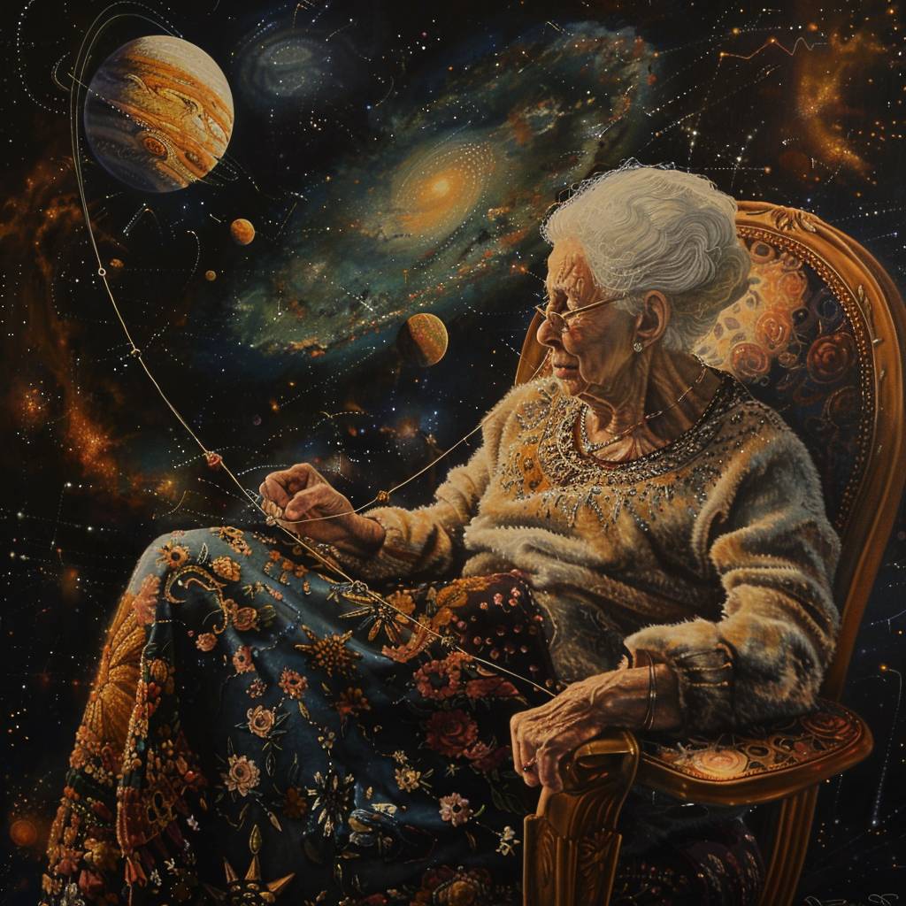 Uma Fate avó senta-se em um aconchegante trono cósmico, tricotando com fios espelhados do tempo, enquanto o sistema solar gira como um mecanismo atrás dela, entrelaçando os futuros das pessoas como um colagem infinita de destino, maximalismo, qualidade cinematográfica, foco nítido, detalhes intrincados.