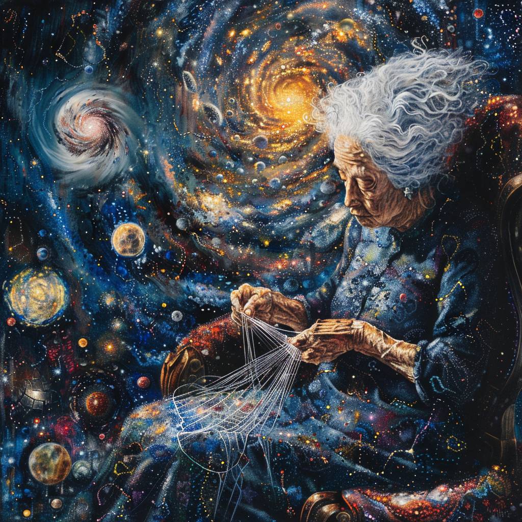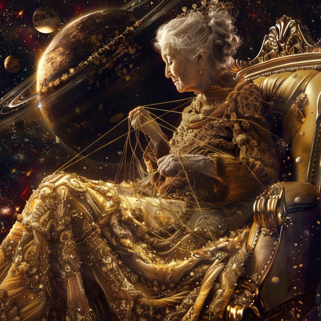A grandmotherly Fate sits on a cozy cosmic throne knitting with mirrored threads of time, the solar system spins like clockwork behind her as she knits the futures of people together like an endless collage of destiny, maximilism, cinematic quality, sharp – focus, intricate details --v 6.0