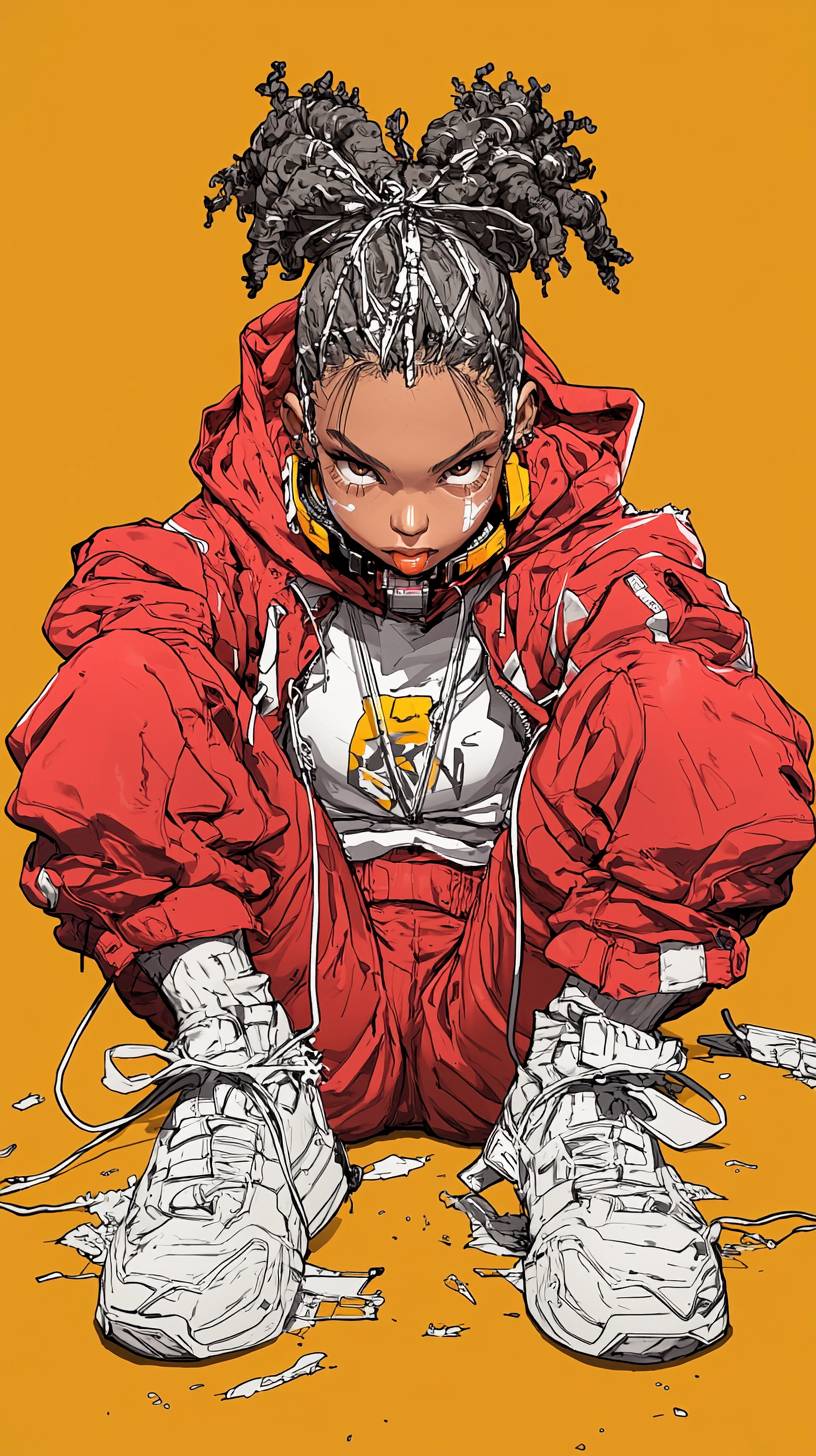 a full body anime style illustration of a woman in a dynamic pose wearing techwear outfit in the style of akihiko yoshida, futuristic cyberpunk, inspired by ghost in the shell, 90s manga aesthetic, expressive face, in the style of afro samurai --chaos 10 --ar 9:16 --quality 2 --style raw --personalize gtbhq5e --stylize 750 --v 6.1