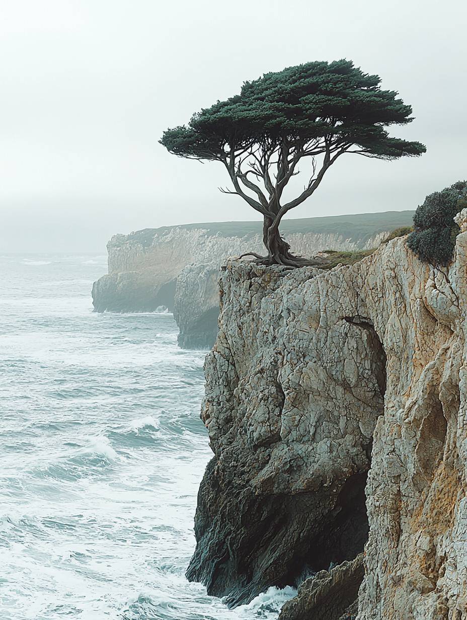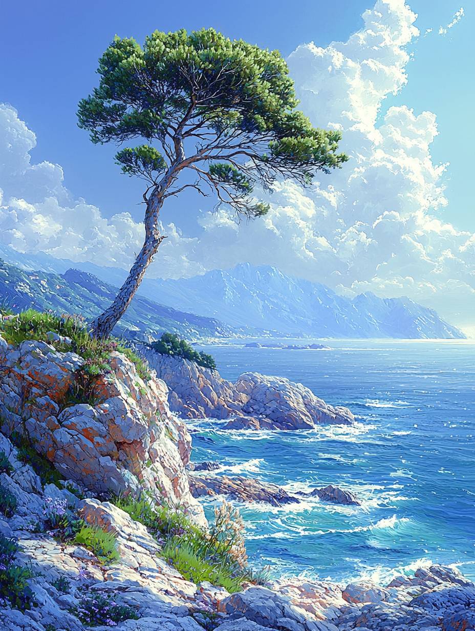Uma imagem fotorealista de uma cena costeira com um cipreste alto sobre as rochas.
