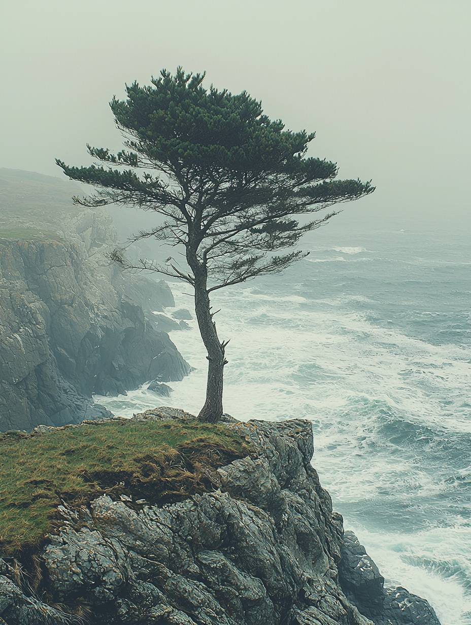 A photorealistic image of a rugged coastal scene with a solitary, tall cypress tree standing firmly on flat, rocky terrain near the ocean. The tree stands upright against the wind, its soft green foliage contrasting with the gray stones and the deep blue of the sea stretching into the horizon. Gentle waves lap at the rocky shoreline, and the air feels fresh and crisp. The lighting is natural and bright, creating the look of a real photograph, emphasizing the serene and powerful beauty of the setting. Ultra-realistic details, cinematic composition, as if captured by a DSLR camera --ar 3:4 --quality 2 --stylize 750 --v 6.1