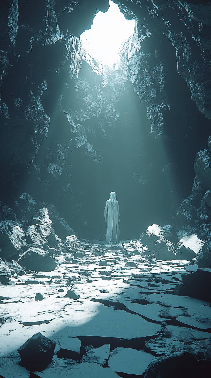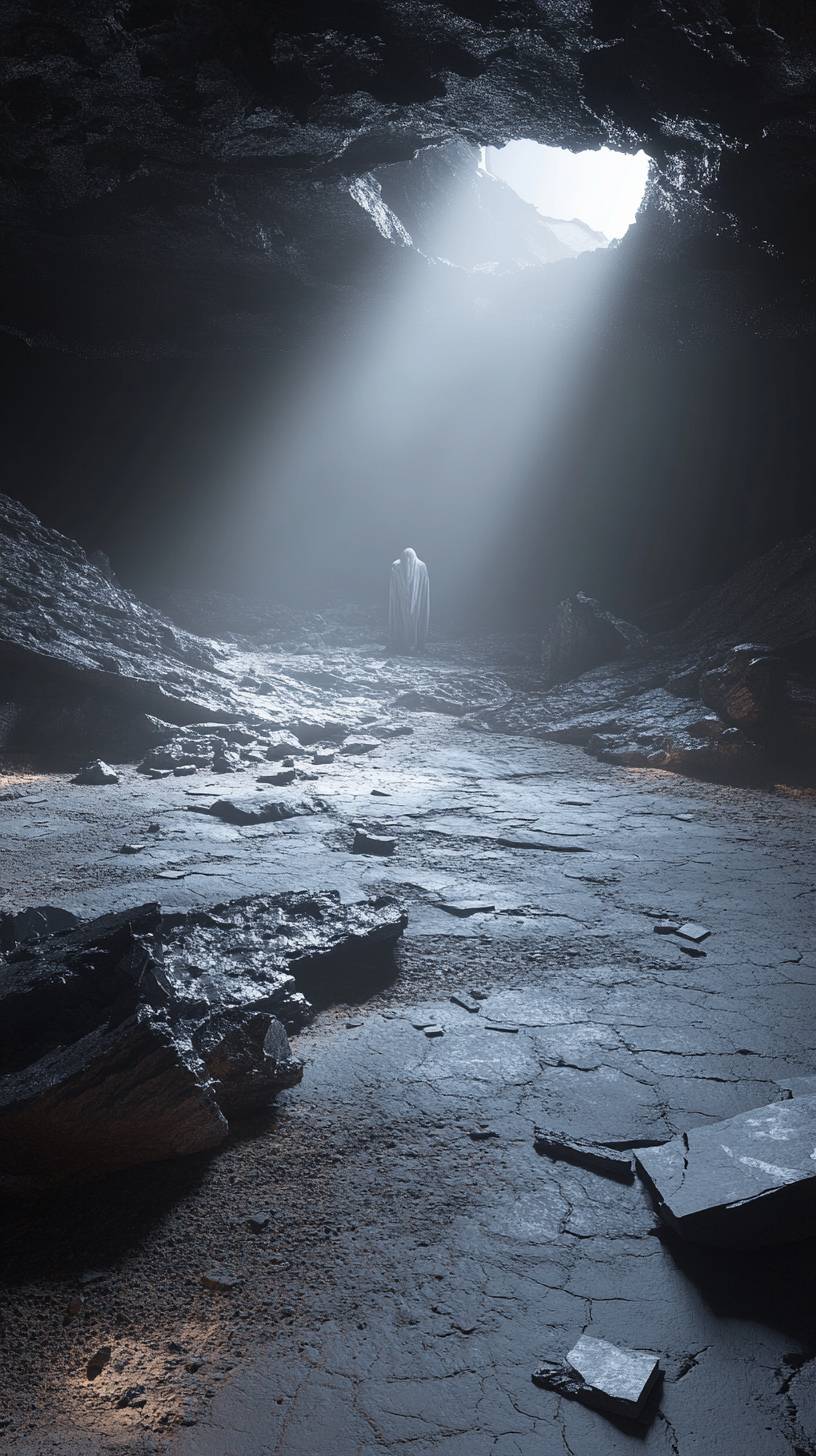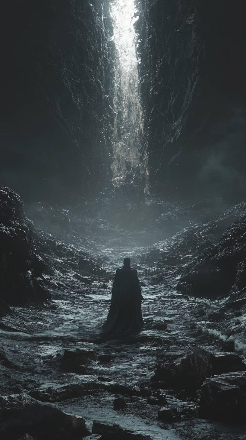A cavernous, desolate landscape enveloped in deep shadows, where jagged rocks rise ominously from the cracked ground. In the center, a faintly glowing fissure spills pale, cold light, casting subtle highlights on the dark terrain. Emerging from the fissure, a humanoid figure cloaked in tendrils of shadow, its form barely distinguishable, exuding an eerie stillness. Mist coils through the air, and fragments of stone hover weightlessly as if the world itself is suspended in anticipation. Hyper-realistic, cinematic, dark fantasy style, muted tones, chilling atmosphere --ar 9:16 --v 6.1