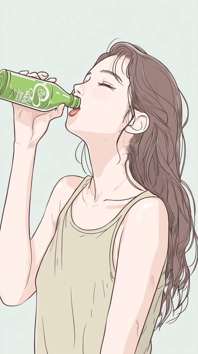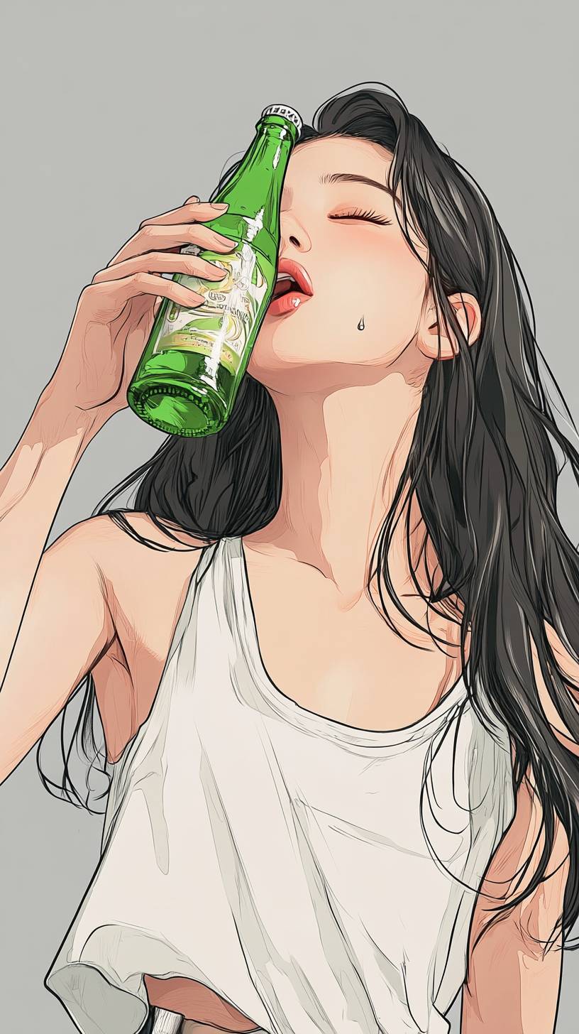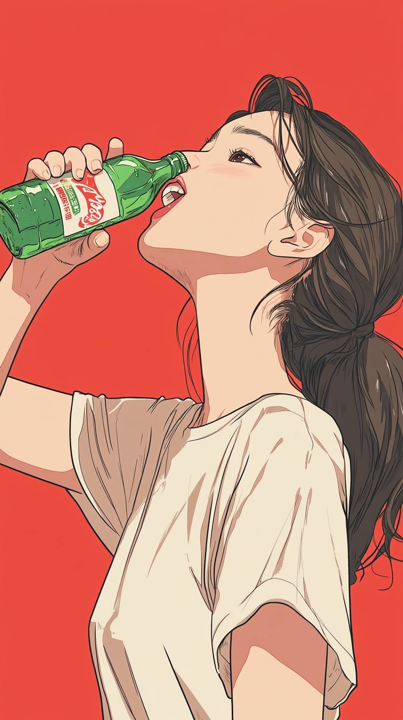 One 18-year-old girls, holding a green bottle of cola in their hands, are drinking it with their heads up and gulping down. She is extremely happy.simple drawing style, simple lines,Chinese comic book illustration, full body portrait, cartoon character --ar 9:16 --v 6.1